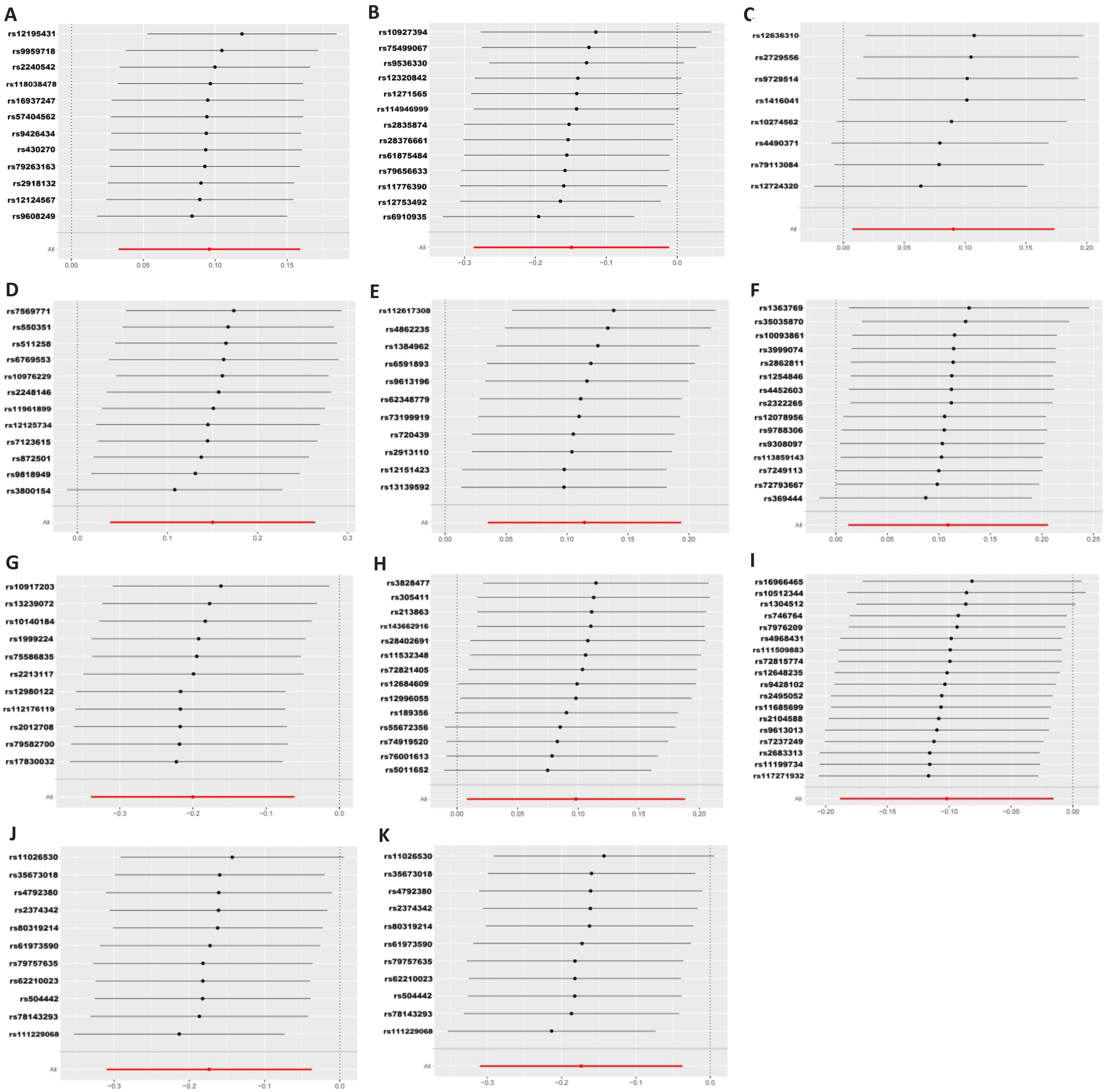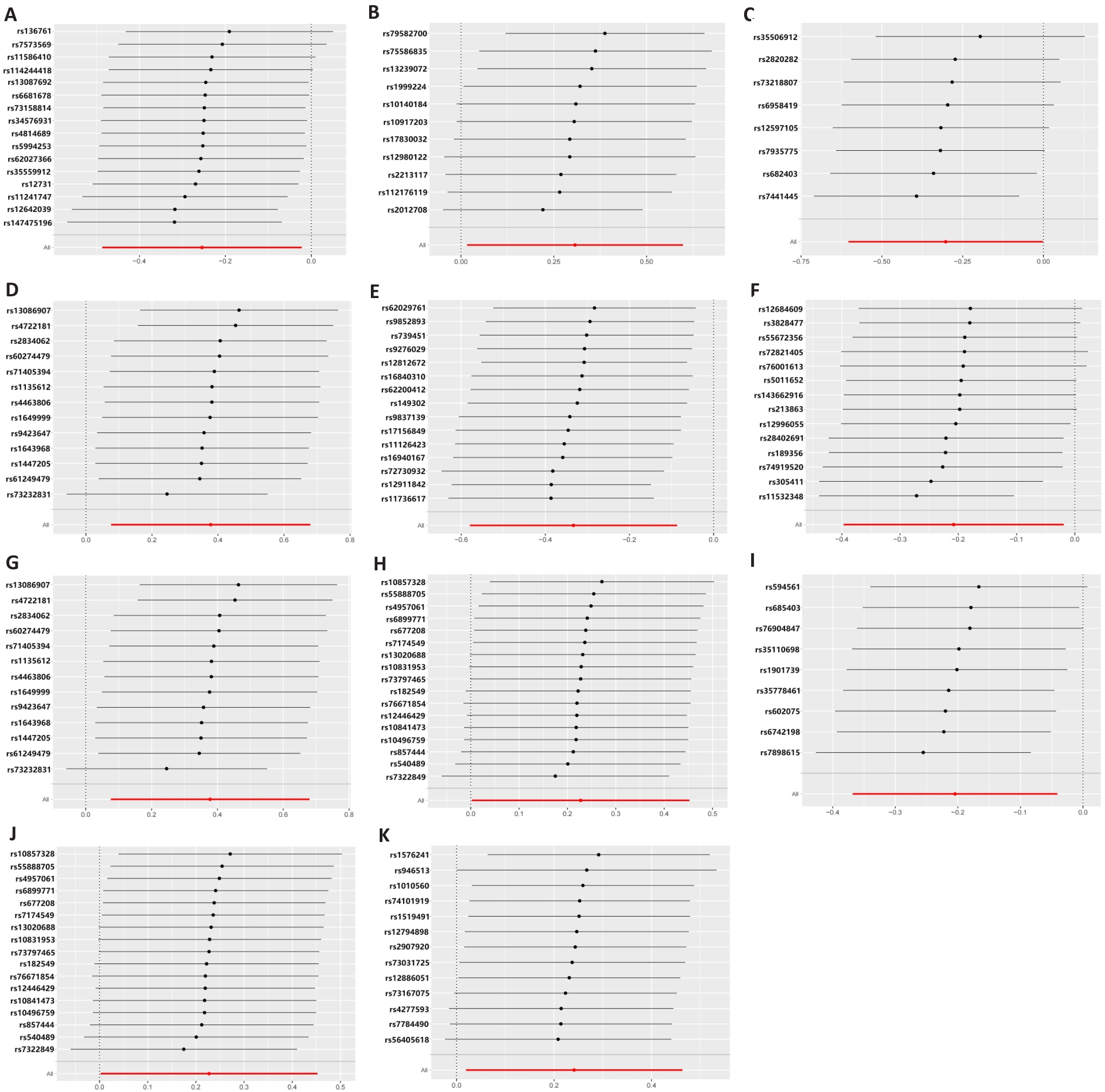 Fig.2 Leave-one-out plot of the association between gut microbiota and colorectal cancer under Mendelian randomization analysis. A: Prevotella7. B: Faecalibacterium. C: Ruminococcaceae UCG011. D: Ruminococcaceae UCG004. E: Eubacterium brachy group. F: Lachnospiraceae FCS020 group. G: Eubacterium xylanophilum group. H: Coprobacter. I: Prevotella9. J: Enterobacteriaceae. K: Enterobacteriales.
