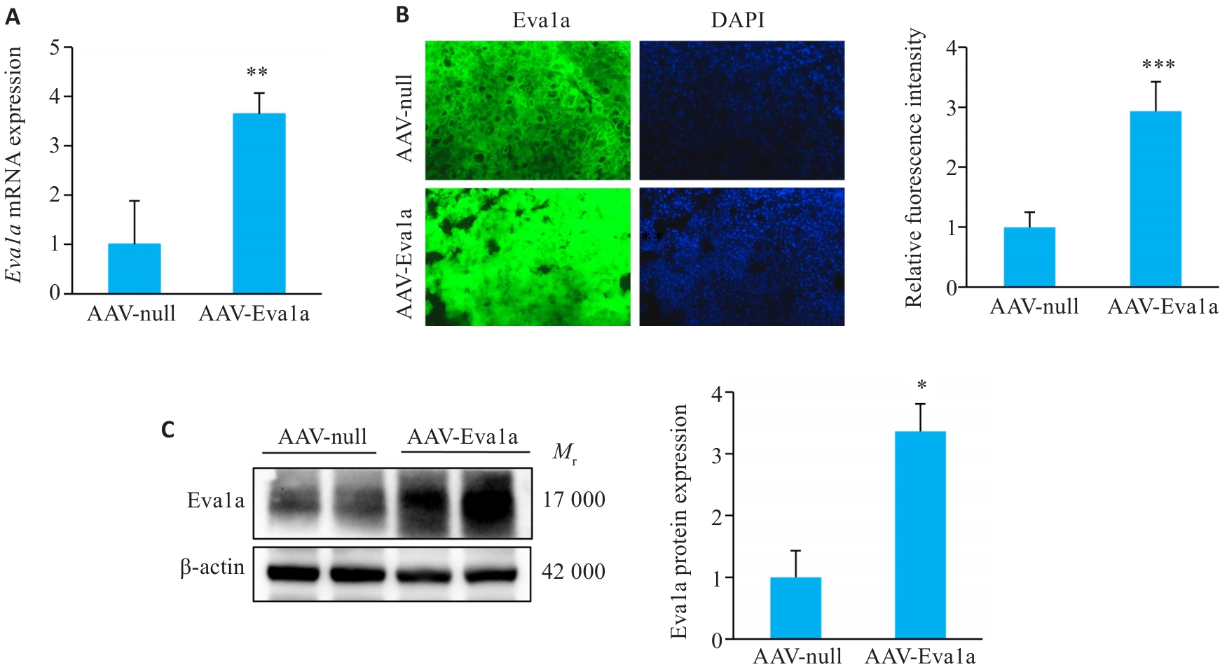 Fig.1 Overexpression of Eva1a in ob/ob mouse liver. A: Relative hepatic Eva1a mRNA levels. B: Immunofluorescence staining for detecting Eva1a expression in mouse liver tissues (Original magnification: ×200). C: Hepatic Eva1a protein expression levels detected with Western blotting. AAV-Eva1a: Mice overexpressing Eva1a; AAV-null: Control mice. *P<0.05, **P<0.01, ***P<0.001 vs AAV-null group.