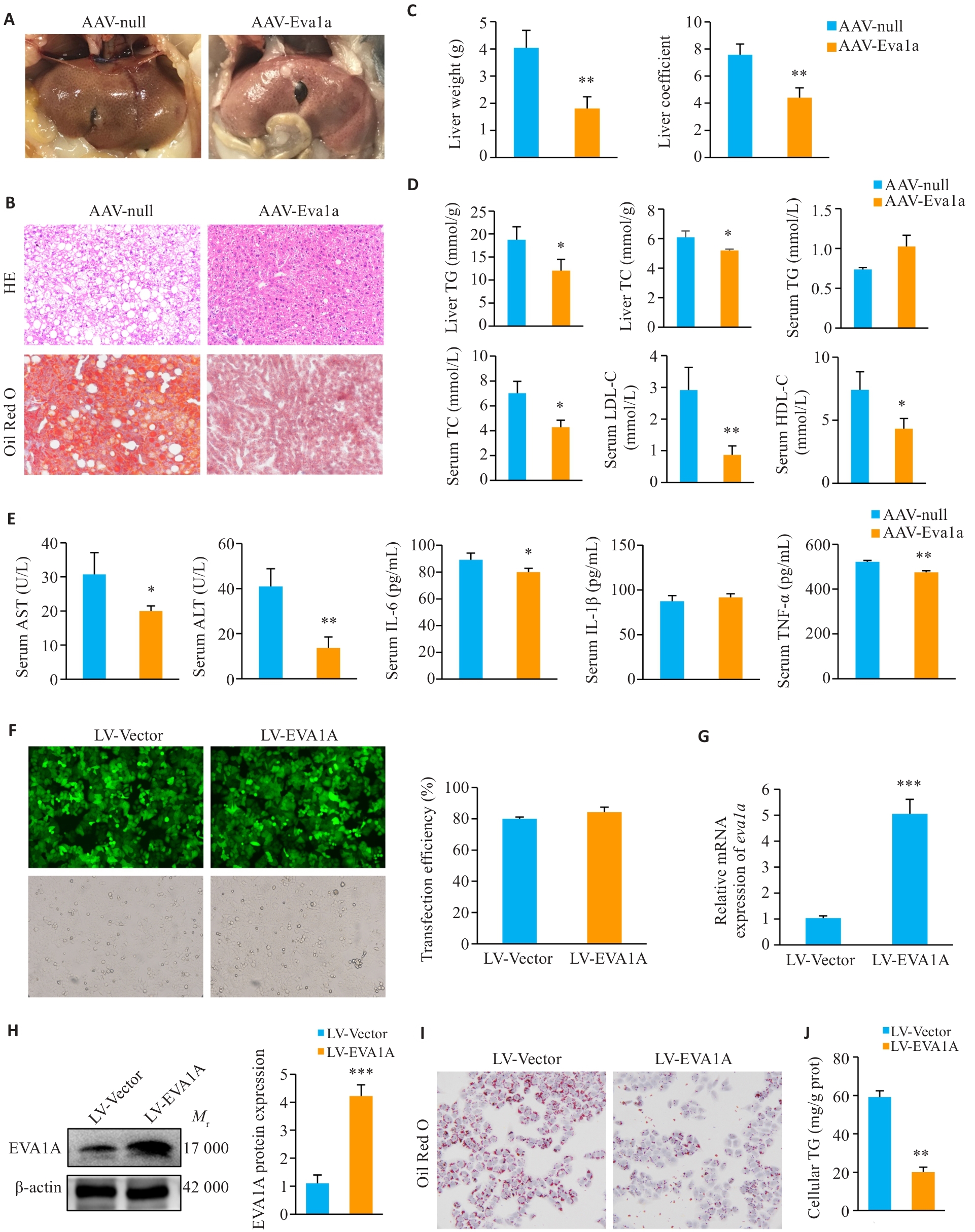 Fig.2 Effect of EVA1A overexpression on steatosis and inflammation in ob/ob mice and on lipid deposition in OA-induced HepG2 cells. A: Observation of mouse livers. B: Liver tissue HE staining and Oil Red O (ORO) staining (×200). C: Liver weight and liver coefficients of the mice. D: Triglyceride (TG) and total cholesterol (TC) levels in mouse livers, and TG, TC, low-density lipoprotein cholesterol (LDL-C), and high-density lipoprotein cholesterol (HDL-C) levels in mouse serum. E: Serum levels of AST, ALT, IL-6, IL-1β, and TNF‑α of the mice. F: Infection efficiency of LV-EVA1A or LV-Vector in HepG2 cells determined by fluorescence microscopy (×200). G: RT-qPCR analysis of Eva1a mRNA levels in HepG2 cells infected with LV-EVA1A or LV-Vector. H: Western blotting of EVA1A protein levels in HepG2 cells infected with LV-EVA1A or LV-Vector. I: ORO staining for lipid droplets in the cells in LV-Vector and LV-EVA1A groups treated with 400 μmol/L OA for 12 h (×400). J: Quantitative analysis of cellular TG contents. AAV-Eva1a: Mice overexpressing Eva1a; AAV-null: Control mice. LV-EVA1A: HepG2 cells overexpressing EVA1A; LV-Vector: Control cells. *P<0.05, **P<0.01, ***P<0.001 vs AAV-null group or LV-Vector group.