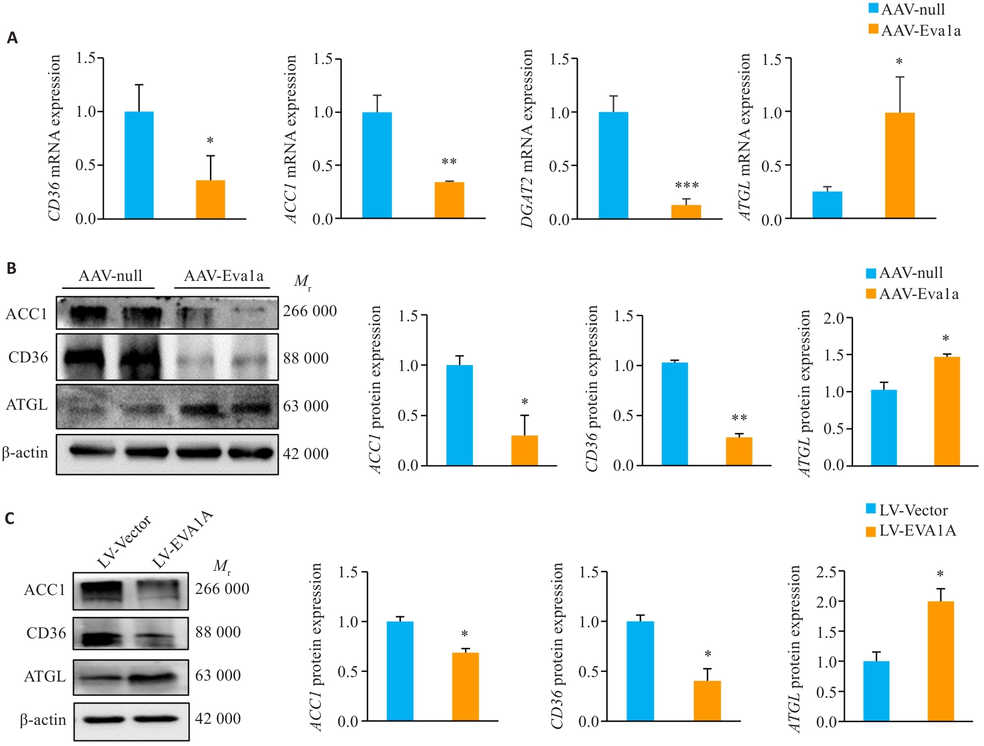 Fig.3 Effect of EVA1A overexpression on expression of lipid metabolism-related genes in the liver of ob/ob mice and in HepG2 cells induced by OA. A: Relative hepatic mRNA levels of CD36, ACC1, DGAT2 and ATGL. B: Protein expression levels of ACC1, CD36, and ATGL in the liver of ob/ob mice. C: Protein expression levels of ACC1, CD36, and ATGL in HepG2 cells treated with OA. *P<0.05, **P<0.01, ***P<0.001 vs AAV-null group or LV-Vector group.
