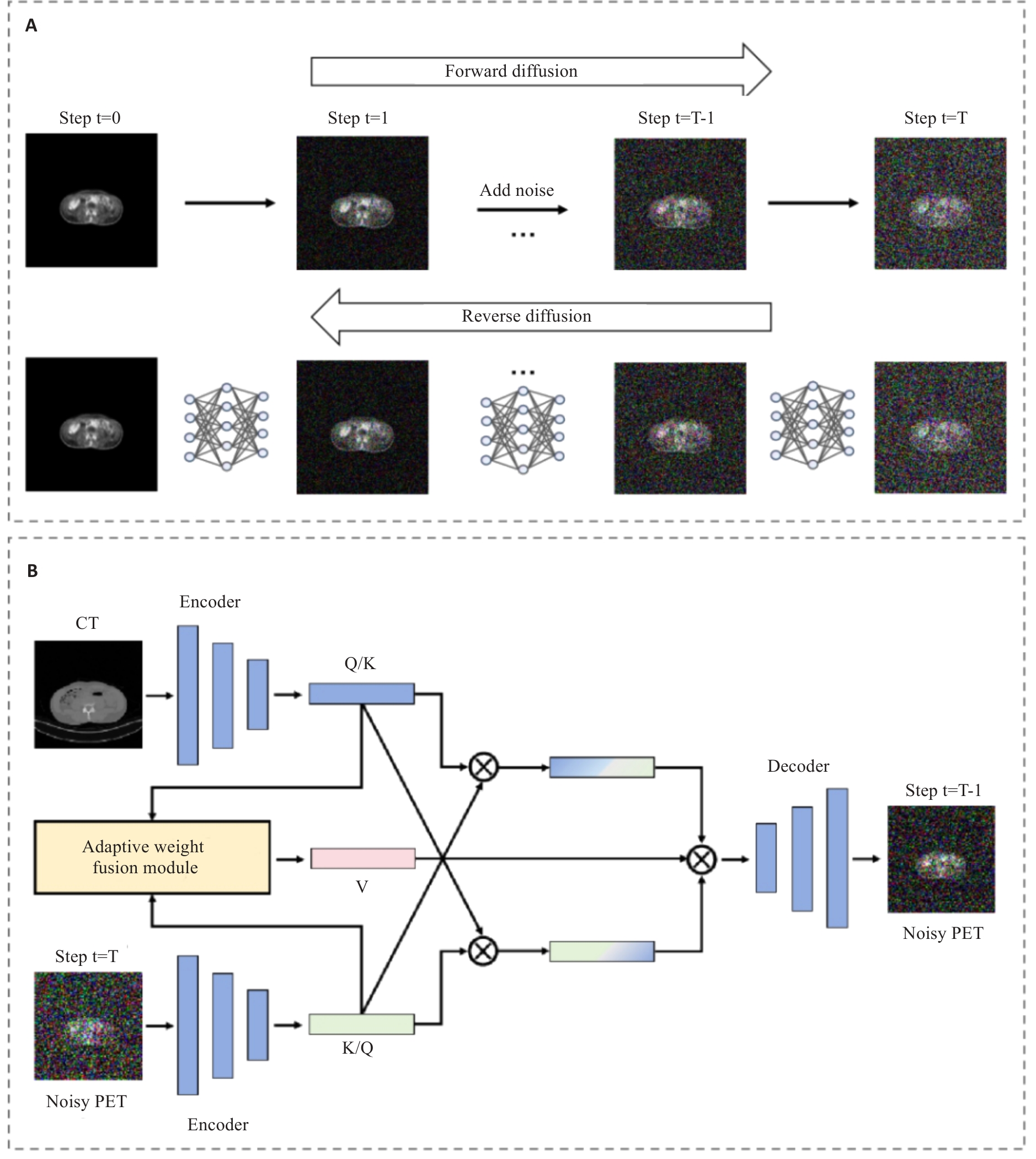 Fig.3 Cross-modal dynamic denoising method of the conditional diffusion module. A: Forward noise addition and reverse denoising reconstruction processes based on Markov chain. B: Structure of the cross-modal dynamic denoising network integrating Adaptive Weight Fusion Module and Bidirectional Cross-Attention