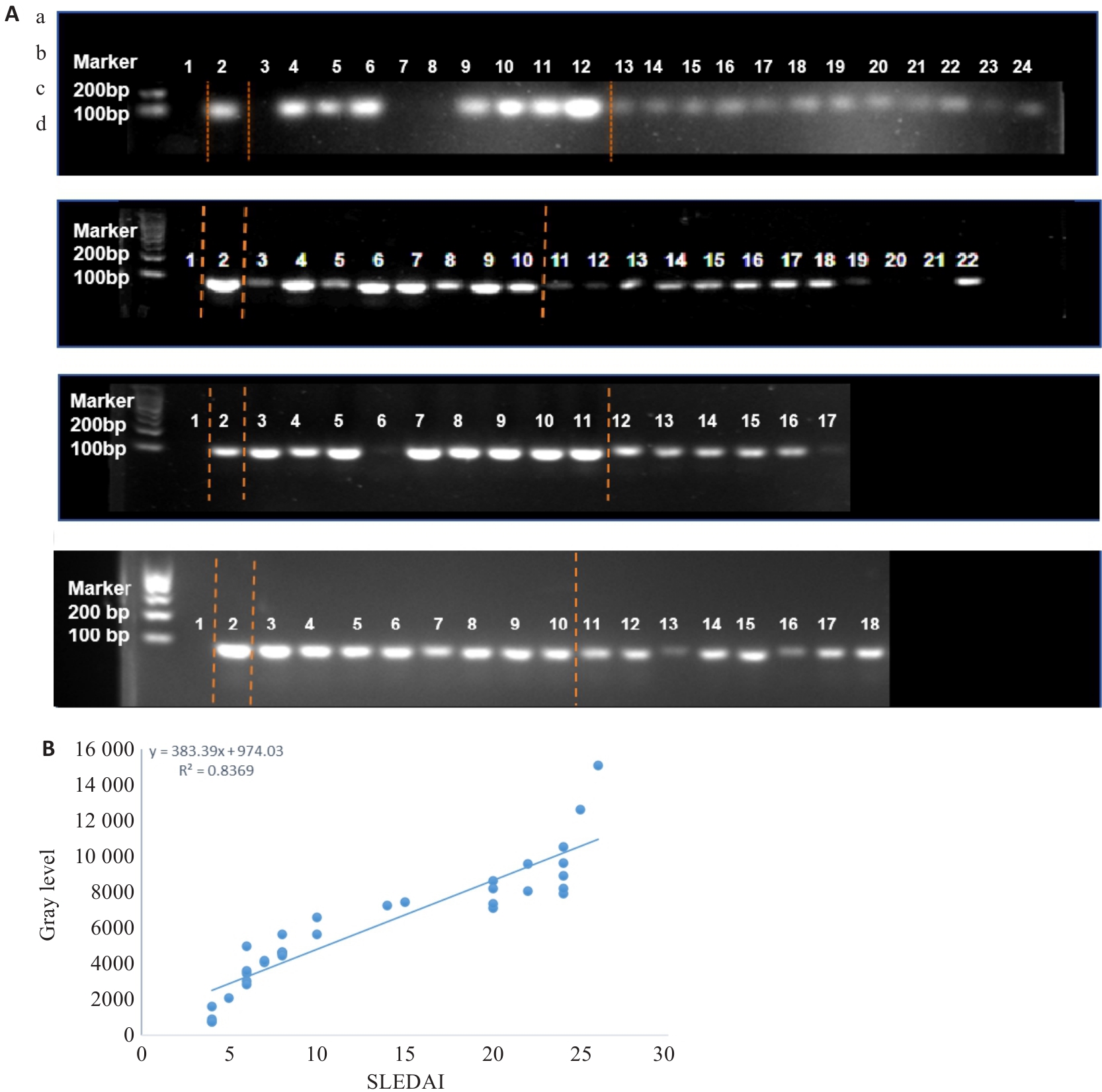Fig.1 Agarose gel electrophoresis of fecal Streptococcus salivarius (SS) nucleic acids. A: Results of agarose gel electrophoresis. Lane 1: Deionized water (negative control); Lane 2: SS standard strain (positive control). a: Lanes 3-12 are SLE group, and lanes 13-24 are HC group; b: Lanes 3-10 are SLE group, and lanes 11-22 are HC group; c: Lanes 3-11 are SLE group, and lanes 12-17 are HC group; d: Lanes 3-10 are SLE group, and lanes 11-18 are HC group. B: Correlation analysis between the grayscale value of fecal SS nucleic acids from SLE patients and the SLEDAI score.