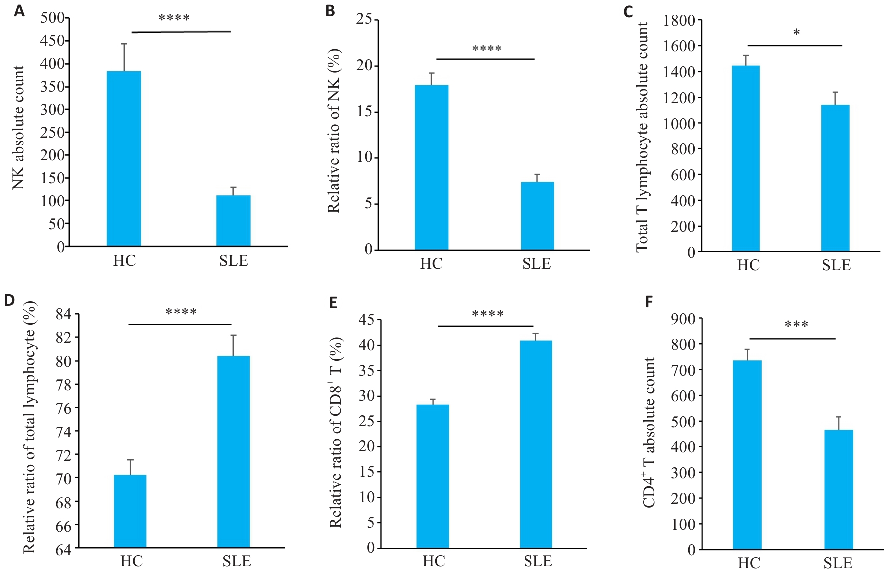 Fig.2 Distribution of peripheral blood immune cell subsets in SLE patients. A, B: NK cell proportions and absolute counts in SLE patients and HC groups. C, D: Total T cell absolute counts and subset proportions. E: CD8+ T cell subset proportions. F: CD4+ T cell absolute counts (n=35 in SLE group, n=38 in HC group). *P<0.05, ***P<0.001, ****P<0.0001.