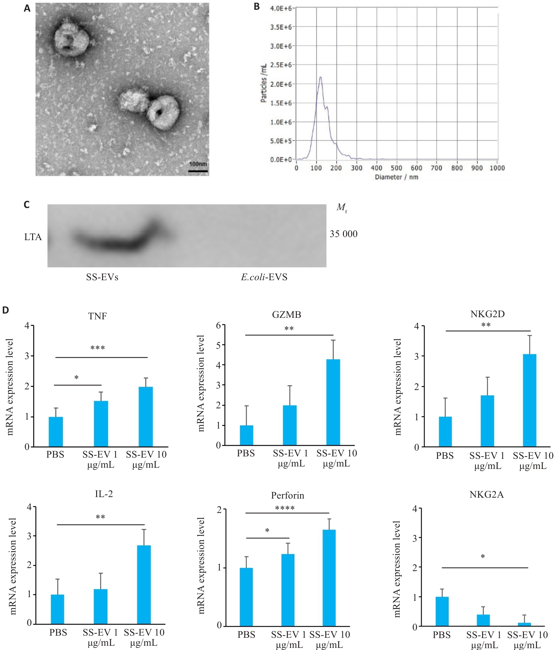 Fig.3 Physical properties of Streptococcus salivarius-derived extracellular vesicles (SS-EVs)and their regulatory effect on NK cell receptors. A: Transmission electron microscopy (TEM) of SS-EVs (Scale bar=100 nm). B: NTA analysis showing size distribution of SS-EVs (100-200 nm). C: Western blotting of LTA protein expression in SS-EVs. D: qPCR analysis of mRNA expression changes of the activating receptors (TNF, GZMB, NKG2D, IL-2, and Perforin) and inhibitory receptors (NKG2A) in NK cells co-cultured with SS-EVs (n=3). *P<0.05, **P<0.01, ***P<0.001, ****P<0.0001.