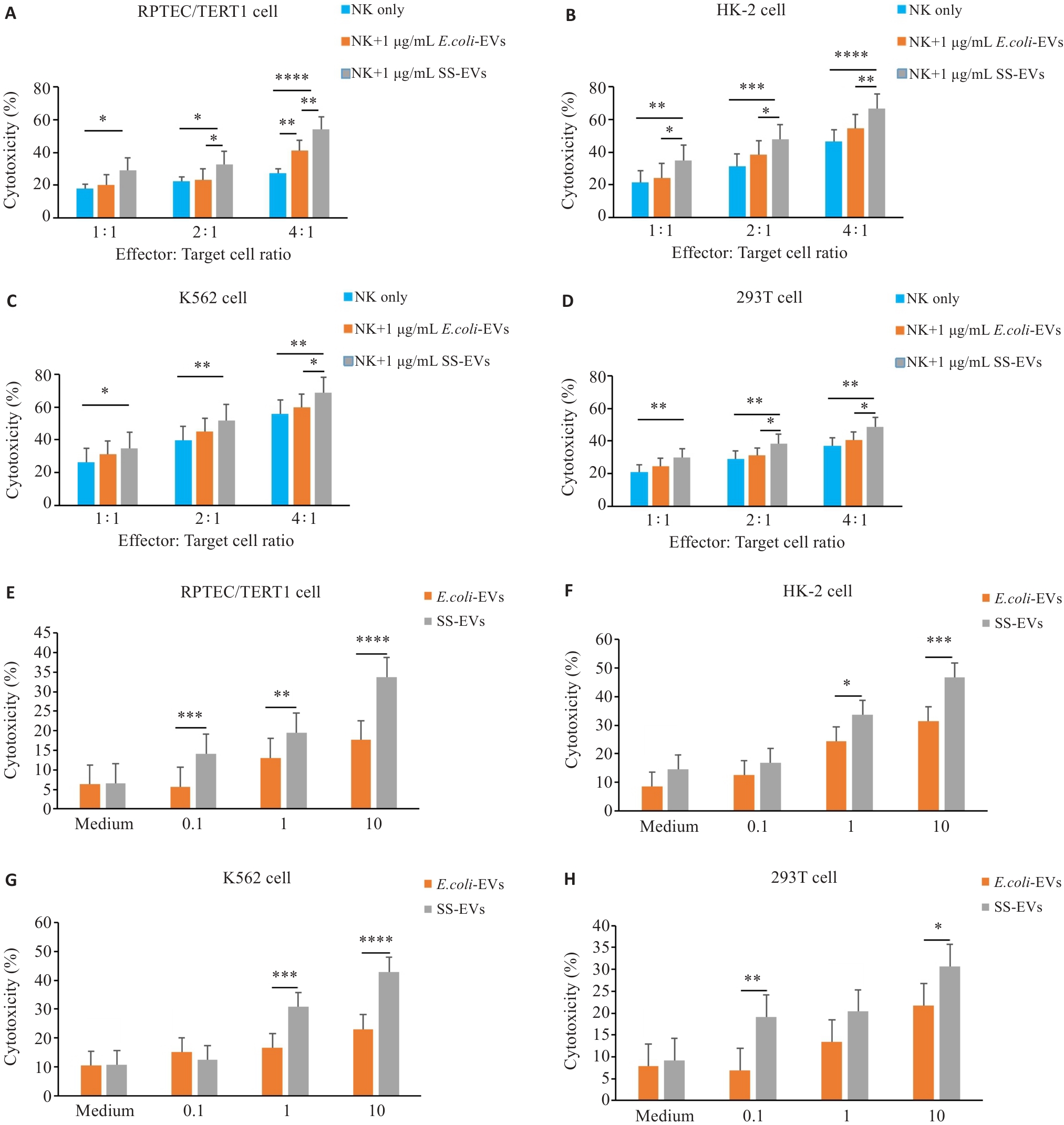 Fig.4 SS-EVs enhance cytotoxic effect of NK cells on target cells. A-D: Relationship between NK cell to target cell ratio (1:1 to 4:1) and NK cell cytotoxicity at a fixed SS-EV concentration (1 μg/mL) (n=3). E-H: Flow cytometry analysis of the effects of varying SS-EV concentrations (0.1-10 μg/mL) on NK cell cytotoxicity against 4 target cells (n=3). *P<0.05, **P<0.01, ***P<0.001, ****P<0.0001.