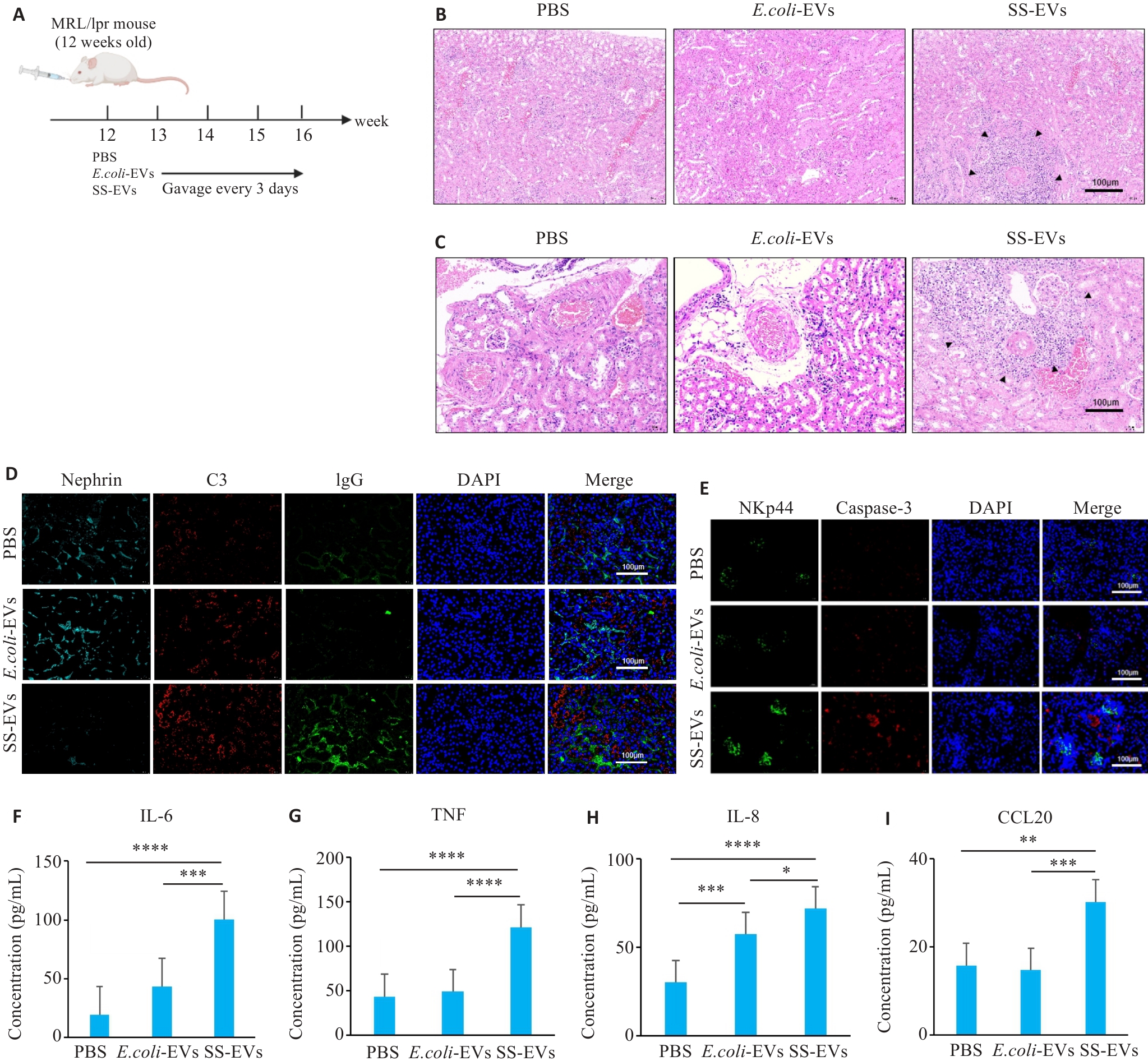 Fig.5 SS-EVs gavage aggravates kidney pathological damage in MRL/lpr mice. A: Schematic diagram of animal grouping and gavage. B: Significant inflammatory cell infiltration in the kidneys of mice gavaged with SS-EVs. C: Significant perivascular inflammatory cell infiltration in the kidneys of mice gavaged with SS-EVs. D: SS-EVs damage the renal medulla and promote immune complex deposition. E:SS-EVs induce NK cell infiltration in the kidneys and renal apoptosis. F-I: ELISA for IL-6, TNF, IL-8, and CCL20 levels in mouse serum (n=6). *P<0.05, **P<0.01, ***P<0.001, ****P<0.0001.