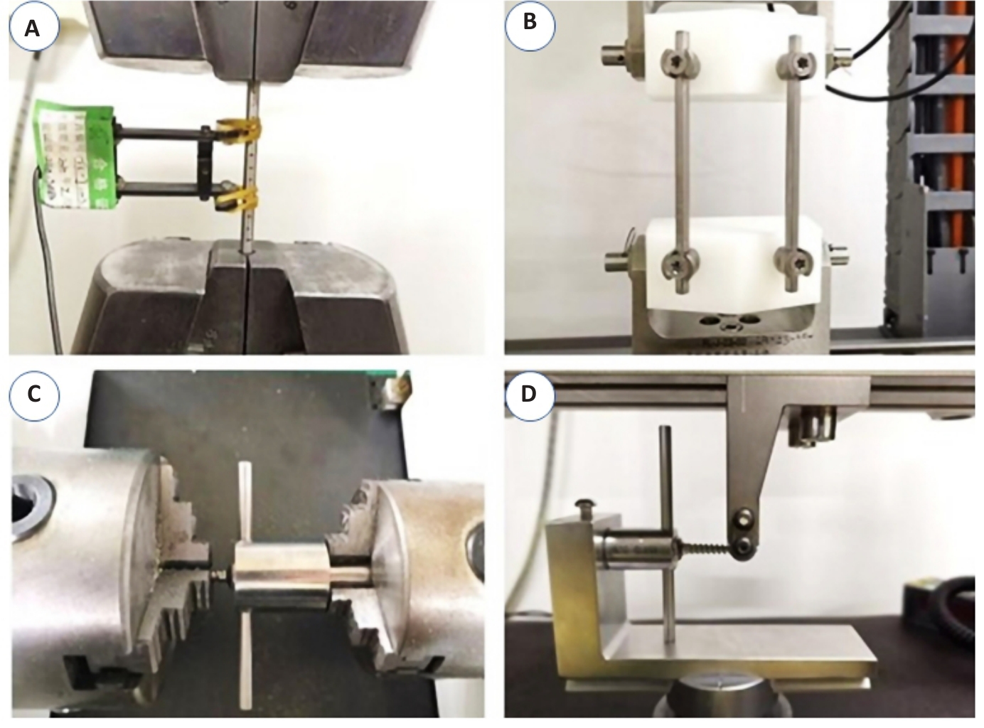 Fig.2 Static mechanical testing of β-titanium alloy screws and rods. A: Tensile test of the β-titanium alloy rod. B: Compression-torsion test of the β-titanium alloy screw-rod system. C: Torsion test of the β-titanium alloy screw. D: Bending test of the β-titanium alloy screw.