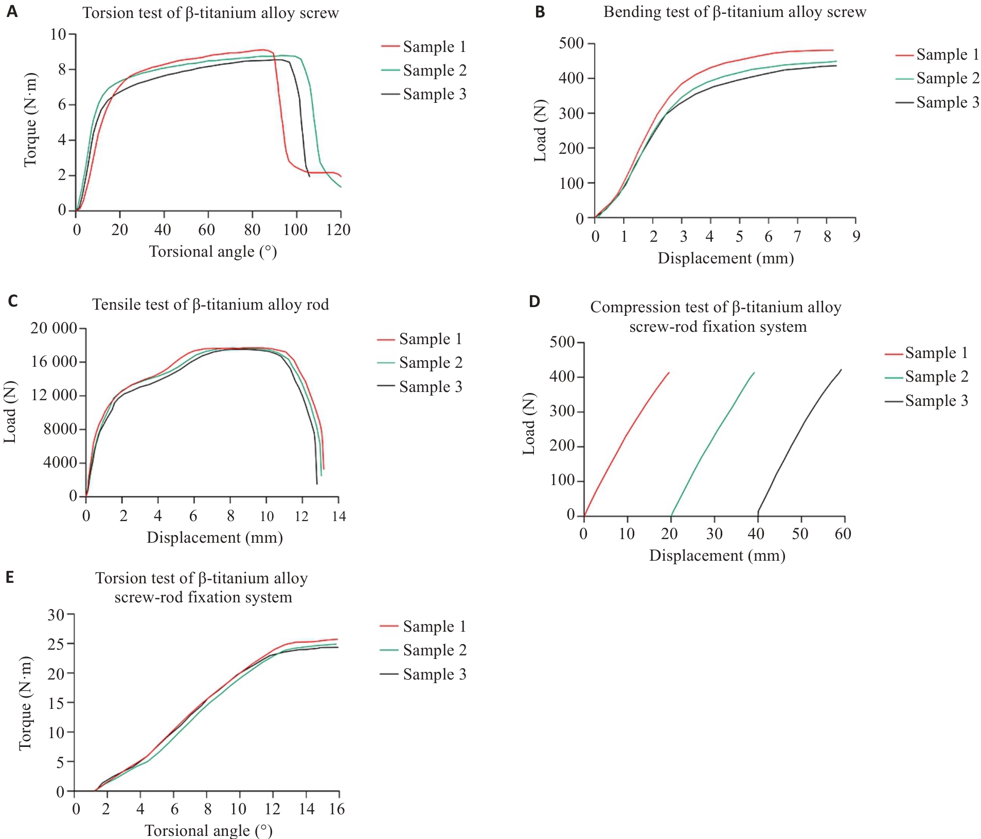 Fig.5 Results of in vitro mechanical testing of the β-titanium alloy pedicle screw-rod fixation system. A: Torsion test of the β‑titanium alloy screw. B: Bending test of the β‑titanium alloy screw. C: Tensile test of the β‑titanium alloy rod. D: Compression test of the β-titanium alloy screw-rod fixation system. E: Torsion test of the β‑titanium alloy screw-rod fixation system.