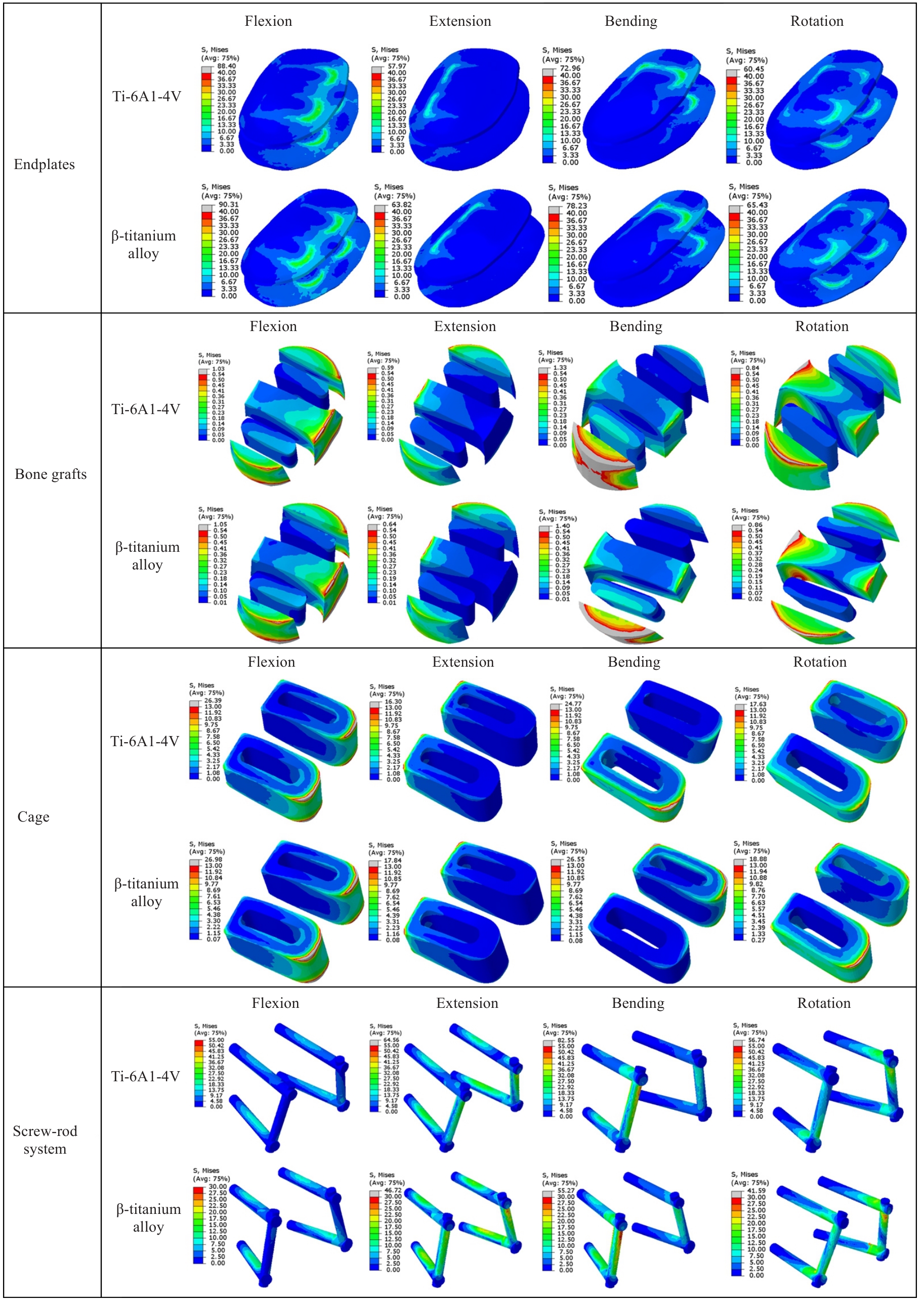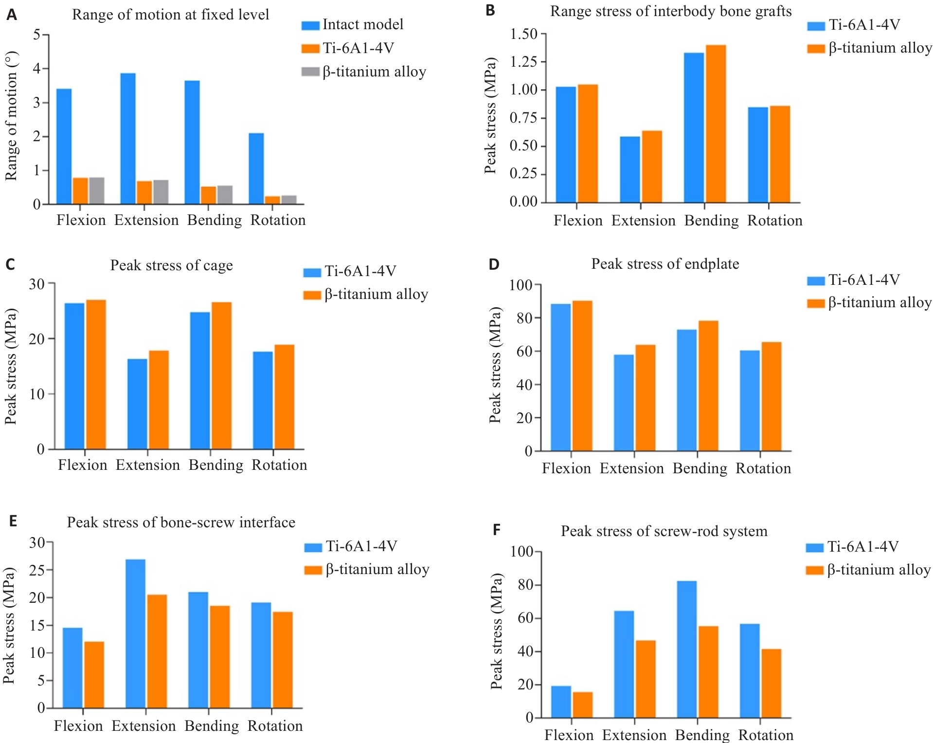 Fig.6 Results of segmental range of motion and stress within components. A: Segment range of motion for each model. B: Peak stress in the interbody bone graft. C: Peak stress in the cage. D: Peak stress in the endplate. E: Peak stress at the bone-screw interface. F: Peak stress in the screw-rod system.