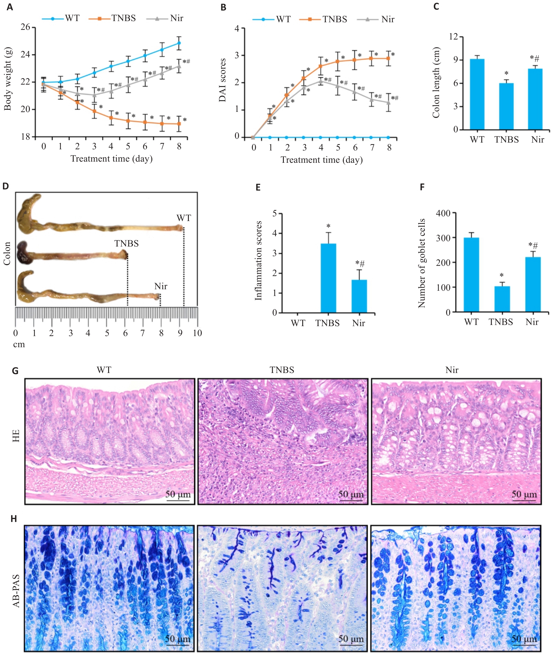 Fig.1 Effects of niranthin (Nir) intervention in mice with TNBS-induced colitis. A: Body weight changes. B: DAI scores. C, D: Colon length. E, G: Inflammation scores and HE staining of mouse colon tissues. F, H: Number of goblet cells and AB-PAS staining. n=6, *P<0.05 vs WT; #P<0.05 vs TNBS.