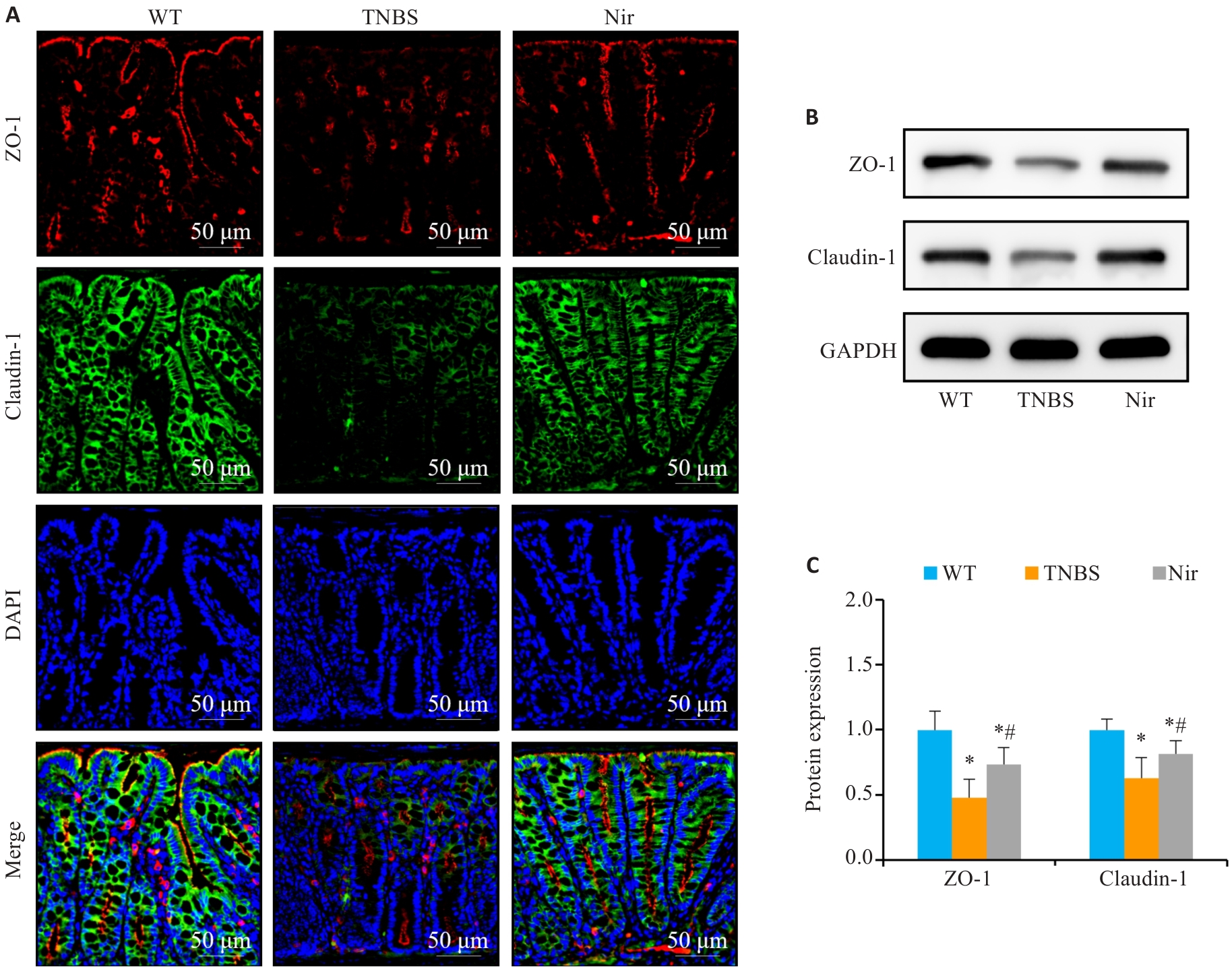 Fig.2 Effects of Nir intervention on intestinal barrier function in TNBS-induced colitis mice. A: Immunofluorescence assay of ZO-1 and claudin-1 expression. B, C: Western blotting for claudin-1 and ZO-1 expressions. n=6, *P<0.05 vs WT; #P<0.05 vs TNBS.