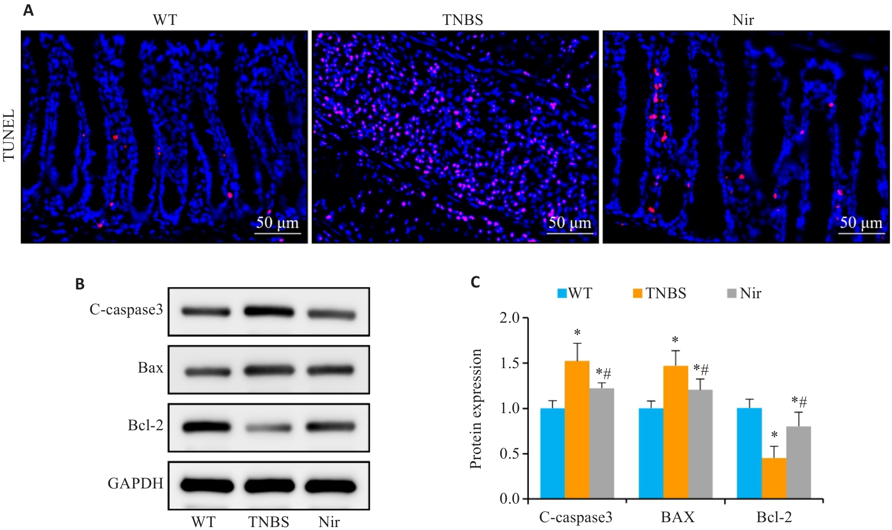 Fig.3 The effect of Nir intervention on colonic cell apoptosis in TNBS-induced colitis mice. A: TUNEL staining. B, C: Western blotting for C-caspase-3, Bax and Bcl-2 expressions. n=6, *P<0.05 vs WT; #P<0.05 vs TNBS.