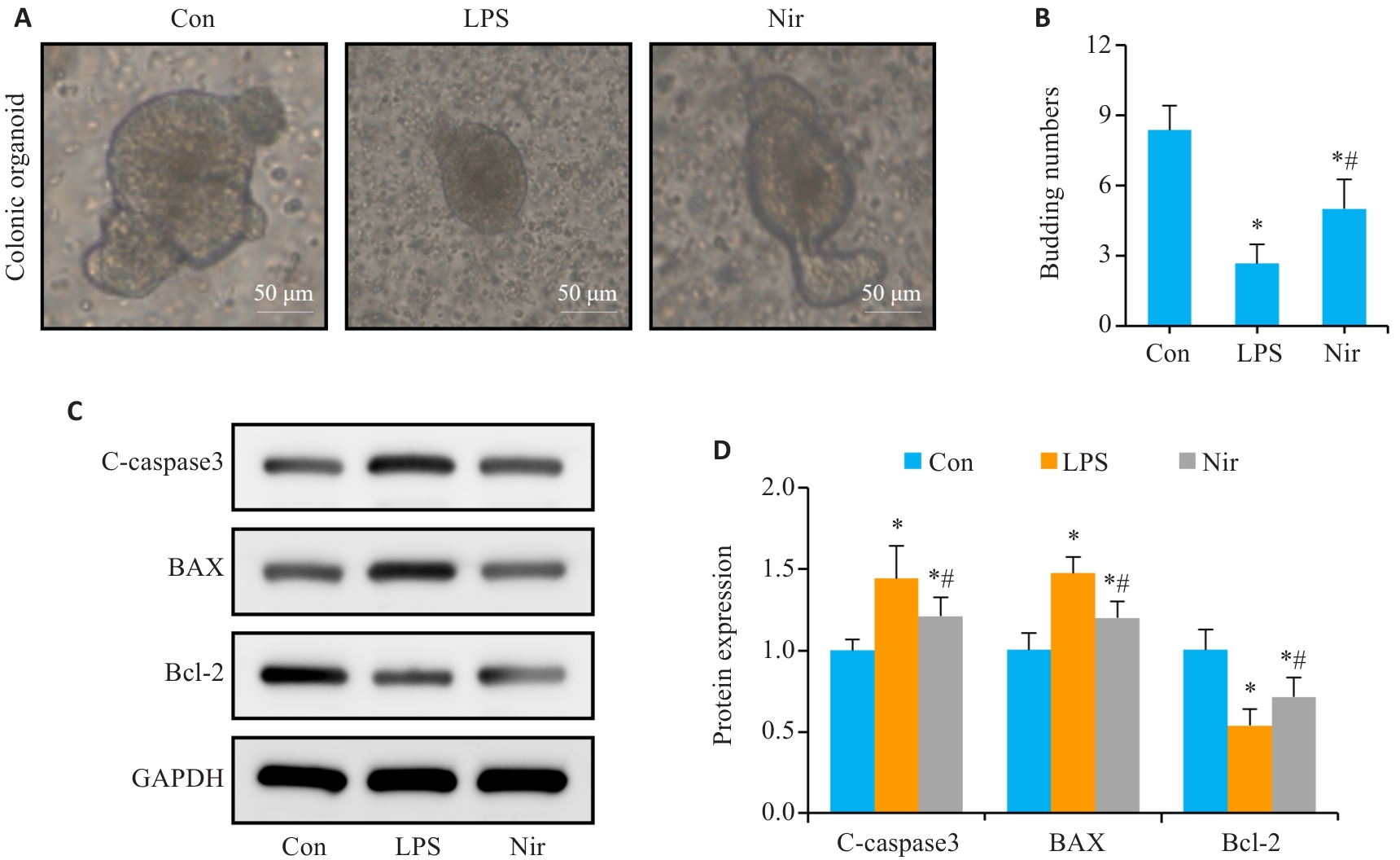 Fig.4 Effect of Nir on LPS-induced intestinal epithelial cell apoptosis in mouse colon organoids. A: Representative images of colon organoids. B: Number of organoids budding. C, D: Western blotting and bar chart for C-caspase-3, Bax and Bcl-2 expressions. n=6, *P<0.05 vs Con; #P<0.05 vs LPS.