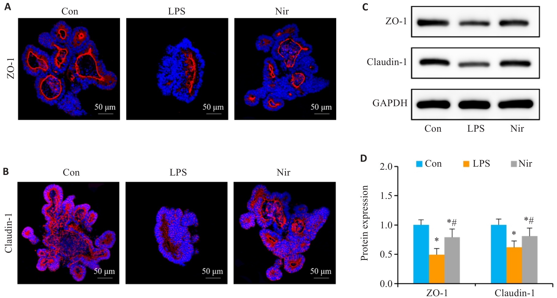 Fig.5 Effects of Nir intervention on intestinal barrier function in LPS-induced colonic organoids. A, B: Immunofluorescence assay of ZO-1 and claudin-1 expression. C, D: Western blotting for claudin-1 and ZO-1 expressions. n=6, *P<0.05 vs Con; #P<0.05 vs LPS.