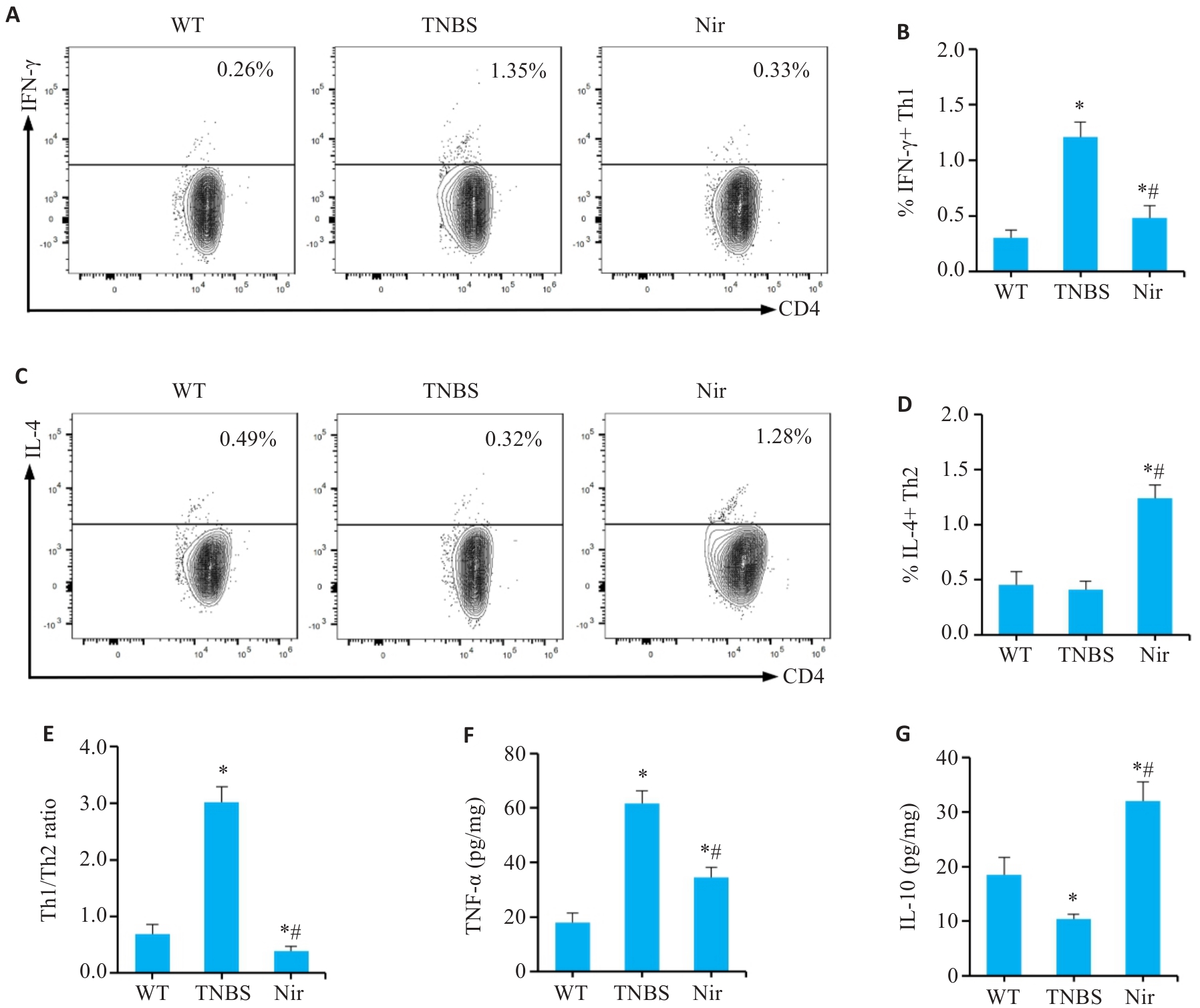 Fig.6 Effects of Nir intervention on Th1/Th2 balance in mesenteric lymph nodes and inflammatory factor levels in colonic tissues of TNBS-induced colitis mice. A, B: Proportion of Th1 cells in the mesenteric lymph nodes. C, D: Proportion of Th2 cells in the mesenteric lymph nodes. E: Th1/Th2 ratio. F, G: Expression levels of intestinal mucosal inflammatory mediators. n=6, *P<0.05 vs WT; #P<0.05 vs TNBS.