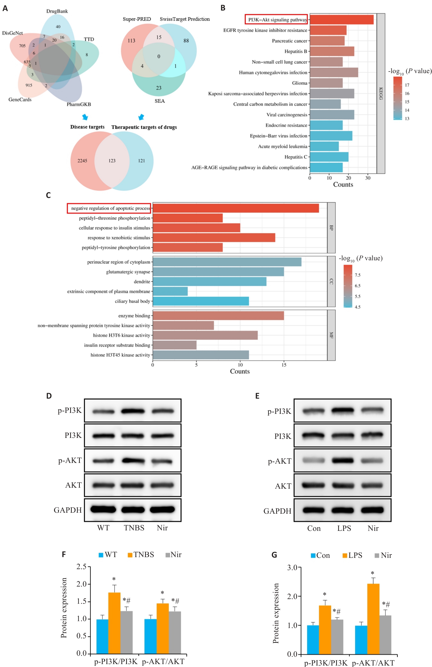 Fig.7 Ameliorative effect of Nir on colitis is possibly associated with the PI3K/AKT pathway. A: Venn diagram. B: KEGG enrichment analysis. C: GO enrichment analysis. D, F: Western blotting of p-PI3K, PI3K, p-AKT and AKT expressions in the colon tissue. E, G: Western blotting of p-PI3K, PI3K, p-AKT and AKT expressions in the colonic organoids. n=6, *P<0.05 vs WT; #P<0.05 vs TNBS.