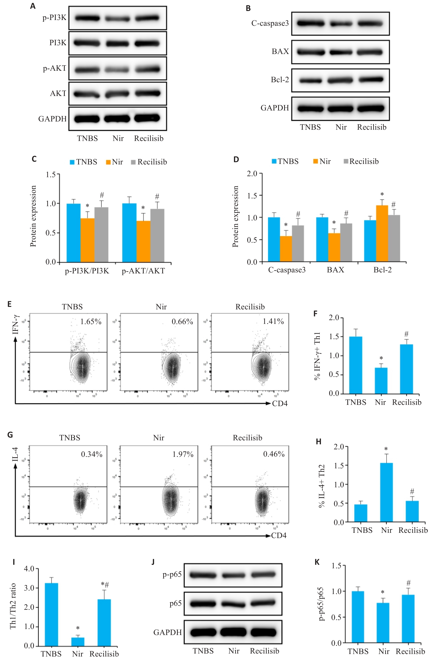 Fig.8 Nir can restore immune homeostasis and barrier integrity by negatively regulating the PI3K/AKT pathway. A, C: Western blotting of p-PI3K, PI3K, p-AKT and AKT expressions. B, D: Western blotting for C-caspase-3, Bax and Bcl-2 expressions. E, F: Proportion of Th1 cells in the mesenteric lymph nodes. G, H: Proportion of Th2 cells in the mesenteric lymph nodes. I: Th1/Th2 ratio. J, K: Western blotting for p-p65 and p65 expressions. n=6, *P<0.05 vs TNBS; #P<0.05 vs Nir.