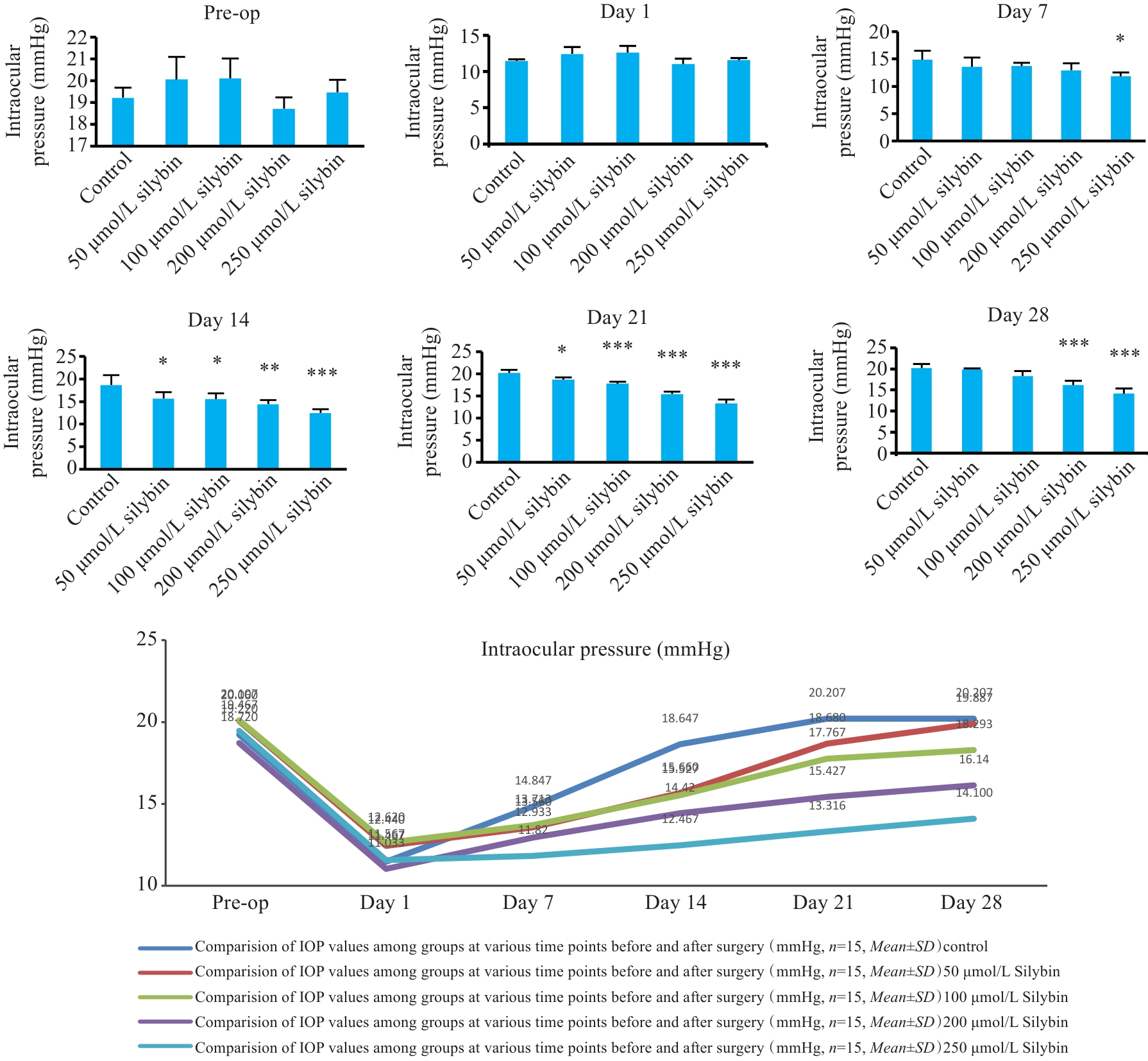 Fig.1 Test results of intraocular pressure of the rabbits in the experimental groups and control group. *P<0.05, **P<0.01, ***P<0.001 vs Control group (n=15).