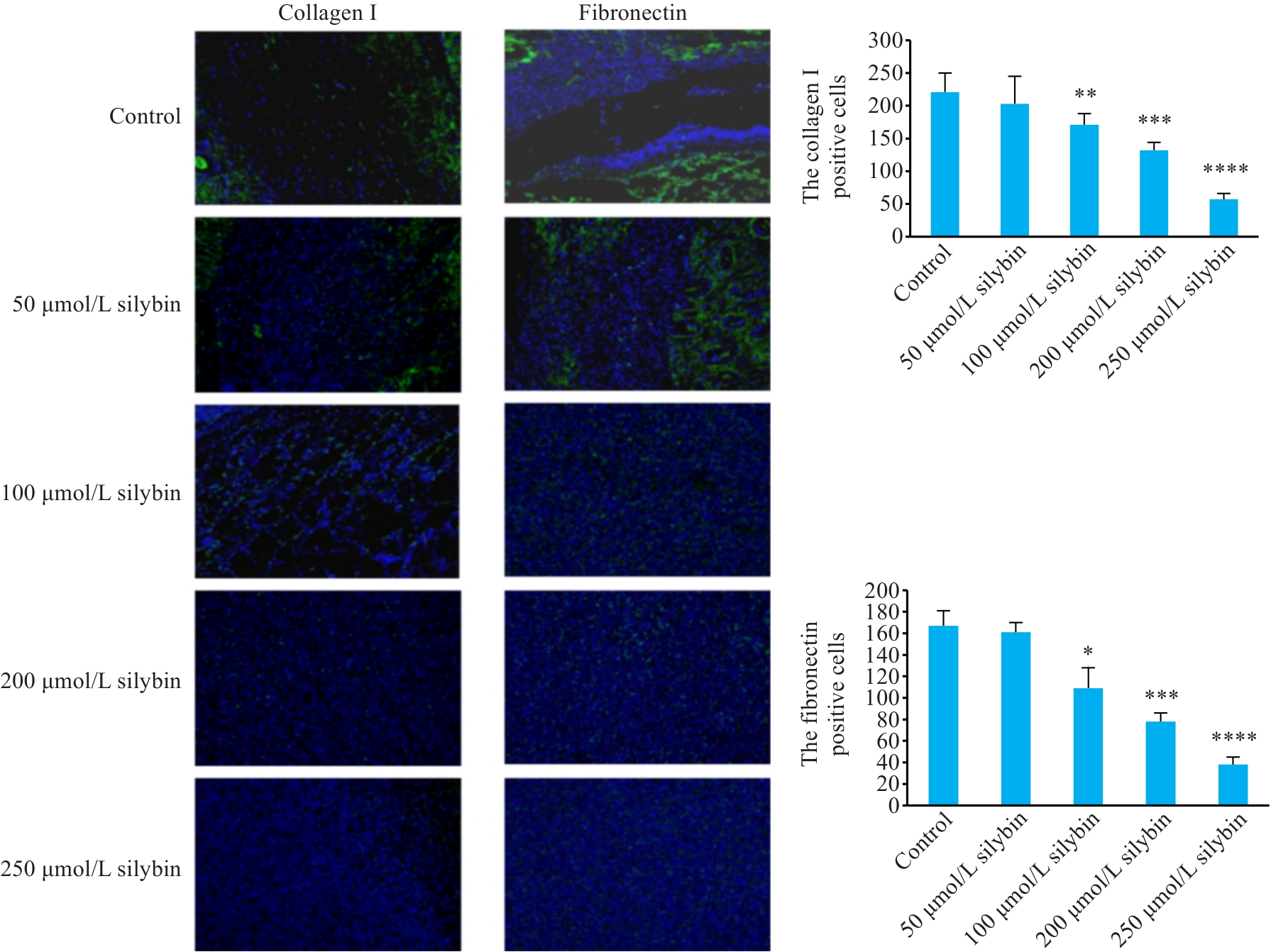 Fig.4 Immunofluorescence staining for fibronectin and collagen I in each group (×40). The nuclei were stained by DAPI (blue under ultraviolet excitation), and green fluorescence indicates positive expression. *P <0.05, **P <0.01, ***P <0.001, ****P <0.0001 vs Control group.