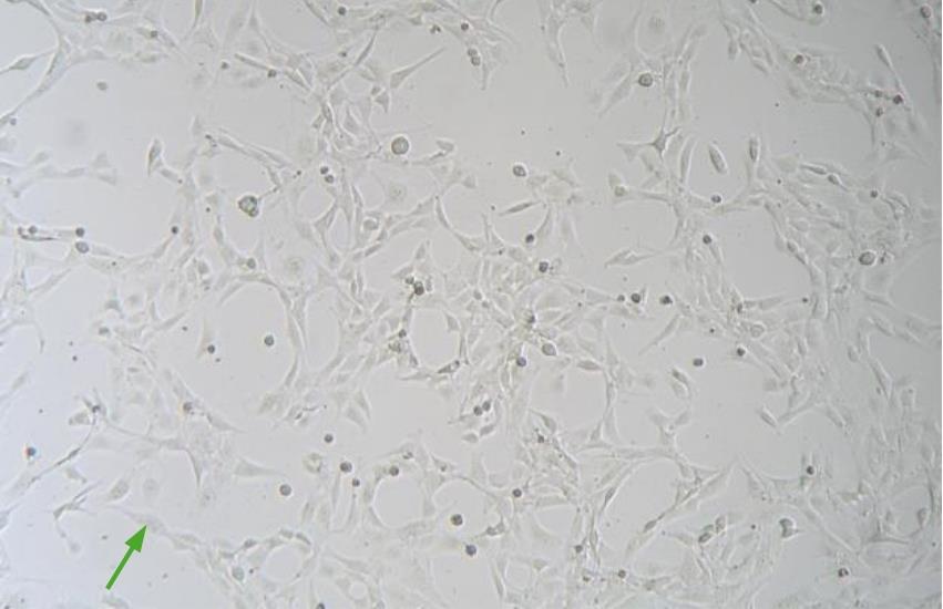 Fig.5 Morphology of cultured rabbit Tenons capsule fibroblasts (RYTF). Green arrow indicates significant fibrosis characteristics of rabbit Tenon's capsule cells (×40).