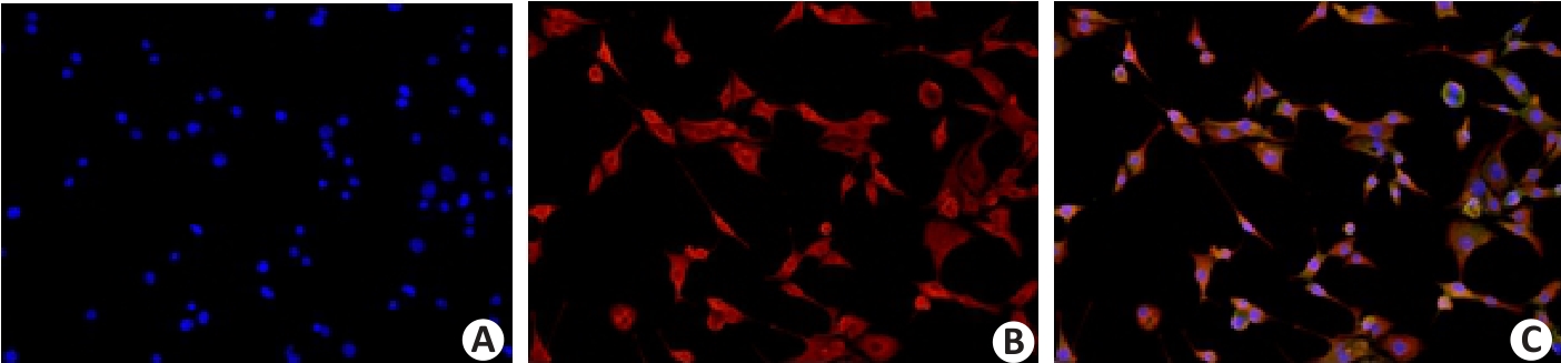 Fig.6 Immunofluorescence identification of RYTF (×400). Cell nuclei were stained blue with DAPI (A). RYTF showed a positive reaction for vimentin with red staining labeled with CY3 (B), while negative staining for keratin with green staining labeled with 488 (C).