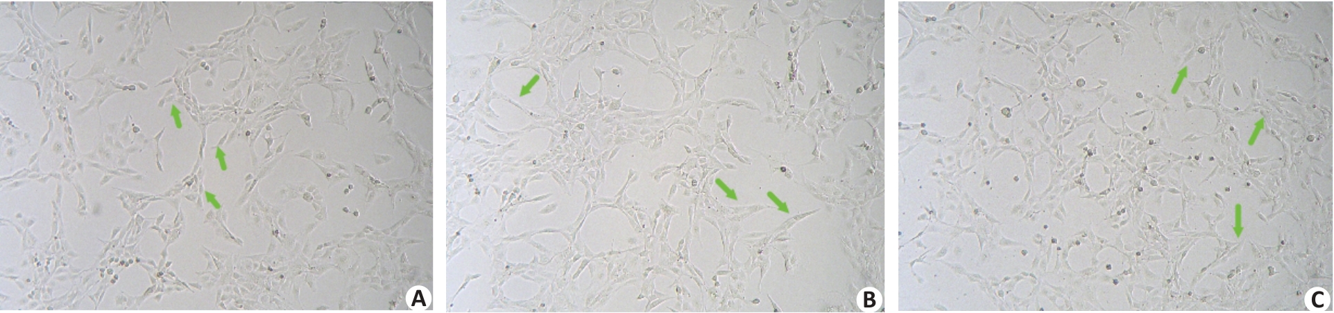Fig.7 Morphological observation of TGF-β1-induced rabbit Tenons capsular fibroblasts treated with silybin (×40). A: Control group. B: TGF-β1 treatment group. C: TGF-β1 and 200 μmol/L silybin treatment group. Green arrows indicate significant fibrosis characteristics of rabbit Tenon's capsule cells.