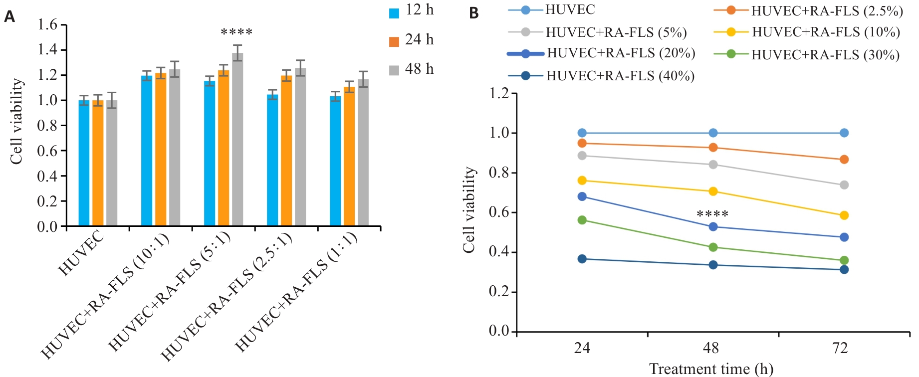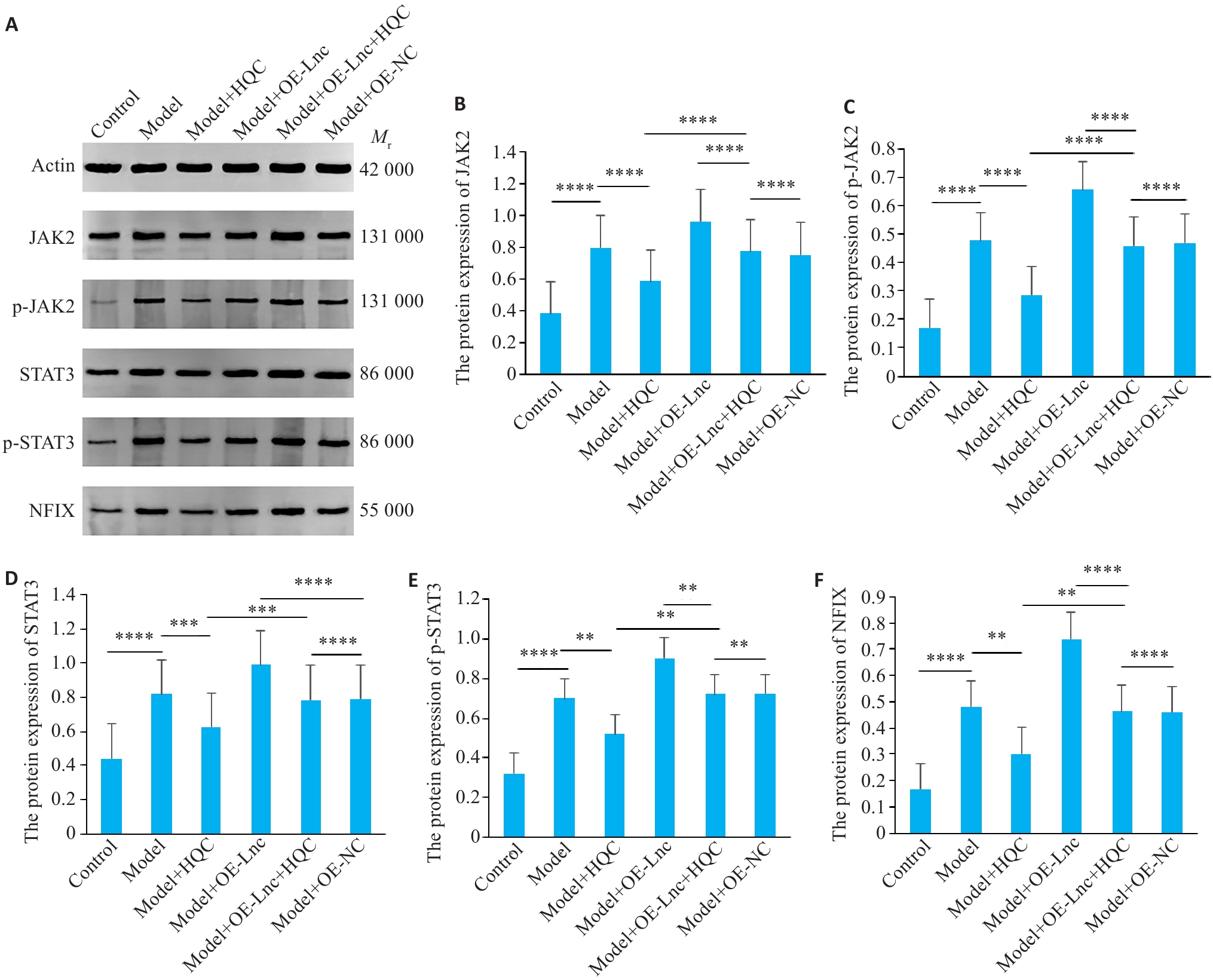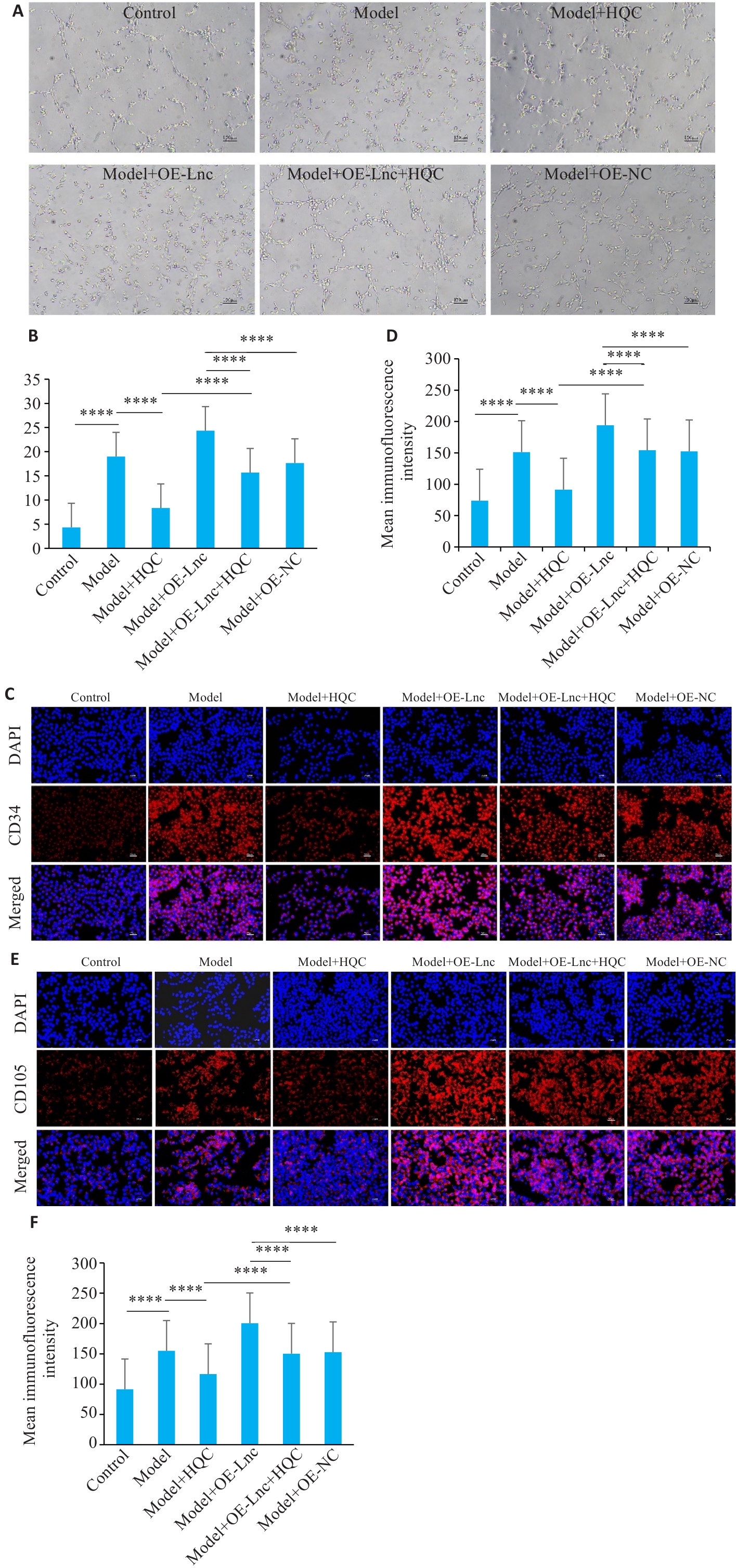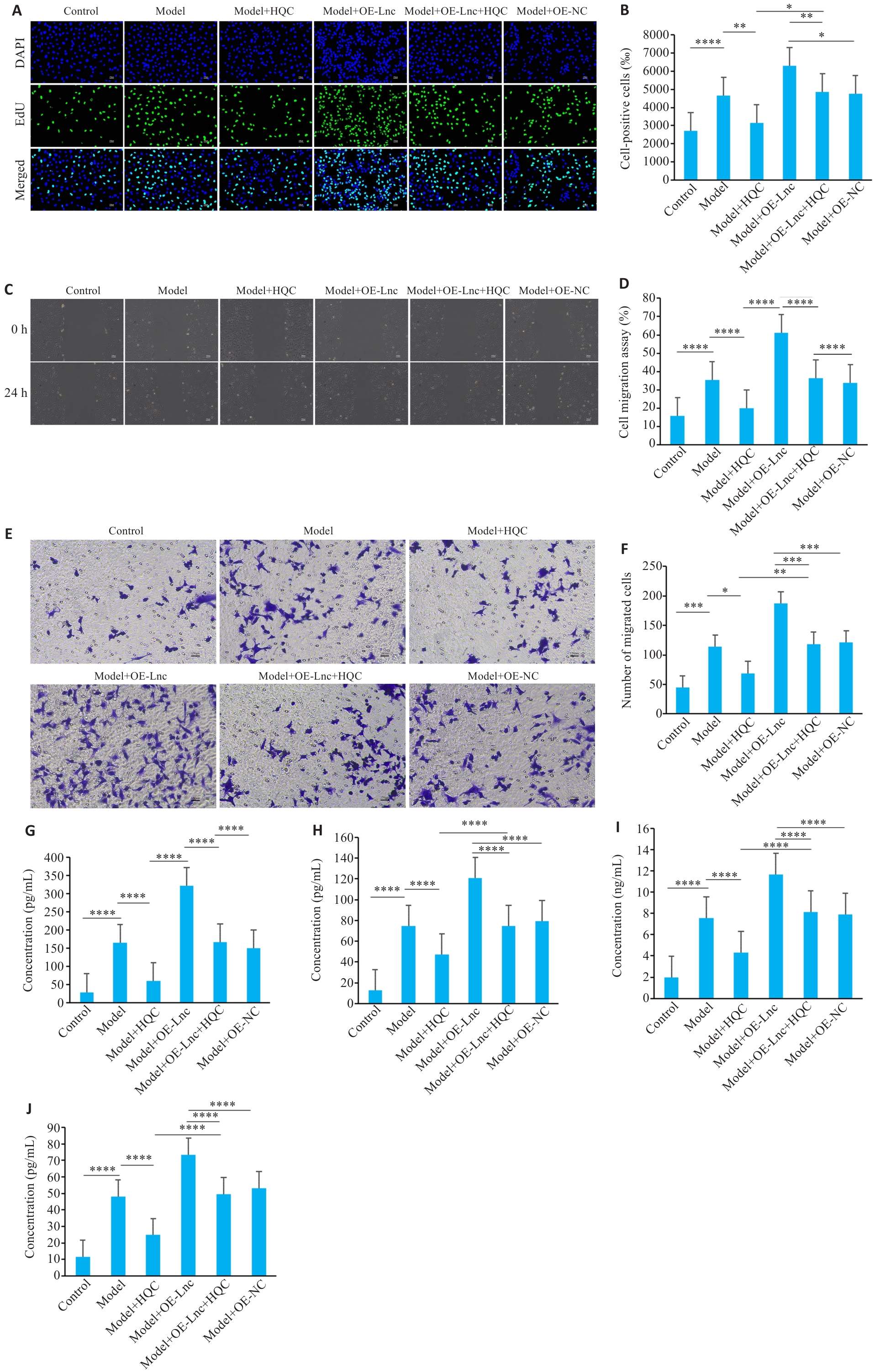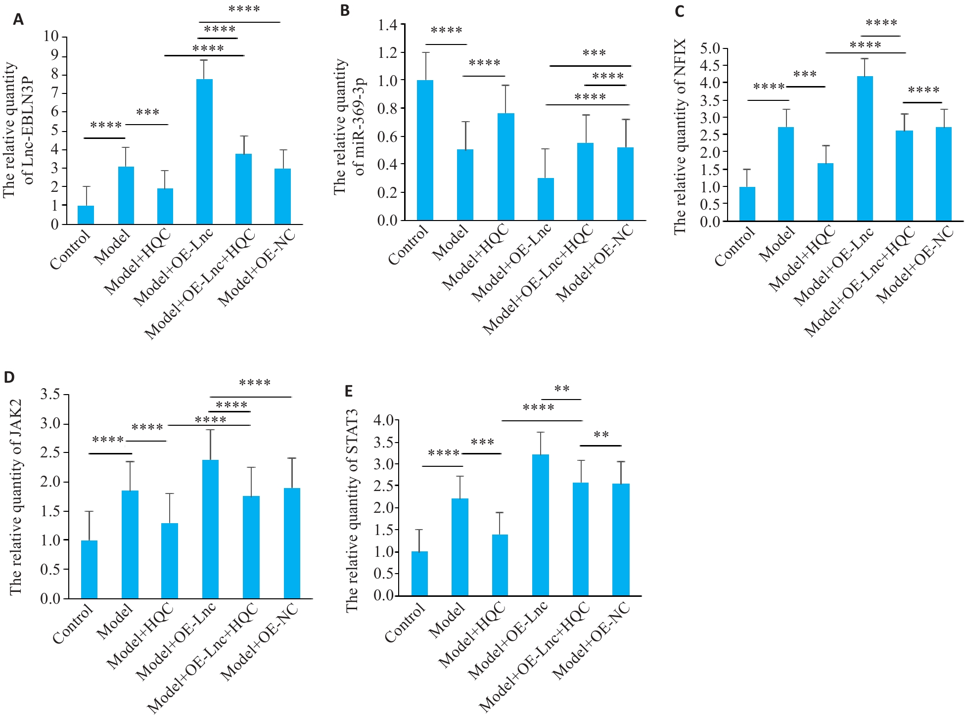 Objective To investigate the mechanism by which Huangqin Qingre Chubi Capsule (HQC) inhibits synovial angiogenesis mediated by the JAK/STAT pathway in rheumatoid arthritis (RA). Methods An optimized co-culture model of RA-derived fibroblast-like synoviocytes (RA-FLS) and human umbilical vein endothelial cells (HUVECs) was treated with gradient concentrations of HQC-medicated serum with or without plasmid transfection for LncRNA EBLN3P overexpression. The inhibitory effects of HQC on pathological behaviors of RA-FLS were assessed using EdU assay, Transwell invasion assay, and scratch wound healing assay. Cellular secretions of pro-angiogenic factors (VEGF and FGF2) and matrix metalloproteinases (MMP2 and MMP9) were measured by ELISA. HUVEC tube formation capacity and expressions of the endothelial markers CD34 and CD105 were evaluated, and the expressions of molecules in the LncEBLN3P/miR-369-3p/NFIX axis and the JAK2/STAT3 pathway were detected using qRT-PCR and Western blotting. Results The RA-FLS exhibited significantly enhanced proliferation, invasion, and migration with upregulated expressions of VEGF, FGF2, MMP2, and MMP9 and dysregulation of tthe LncEBLN3P/miR-369-3p/NFIX axis, as shown by decreased miR-369-3p and increased expressions of LncEBLN3P, NFIX, JAK2, STAT3, p-JAK2, and p-STAT3. Treatment with HQC-medicated serum effectively reversed these pathological changes, suppressed malignant phenotype of the cells, downregulated angiogenic and matrix-degrading factors, and inhibited the axis and pathway activity. In the LncRNA EBLN3P overexpression (OE-Lnc) model, HQC treatment less effectively reversed the pathological phenotype and pathway activation in the cells as compared to its effect in the non-overexpression setting. Conclusion HQC inhibits pro-angiogenic function of RA-FLS likely by targeting the LncRNA EBLN3P/miR-369-3p/NFIX axis, thereby suppressing the downstream JAK/STAT signaling pathway.