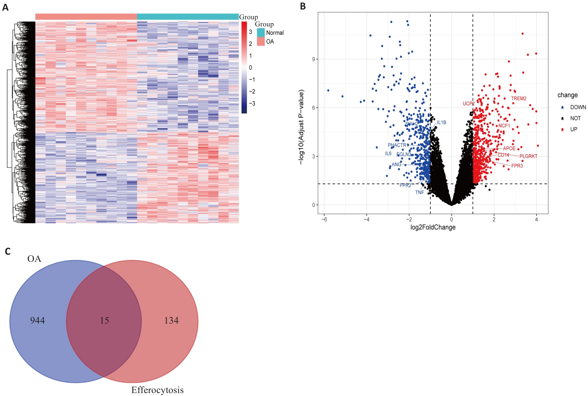 Fig.1 Differential gene expression analysis between osteoarthritis (OA) patients and healthy controls. A: Gene expression heatmap between OA patients and healthy controls. Red represents up-regulated expression, and blue represents down-regulated expression. B: Volcano plot of differentially expressed genes (DEGs). Black dots indicate genes with no significant differences, red dots indicate significantly up-regulated DEGs, and blue dots indicate significantly down-regulated DEGs. The figure displays efferocytosis-related DEGs. C: Venn diagram of the intersection between DEGs in OA and efferocytosis-related gene sets, obtaining 15 efferocytosis-related DEGs.