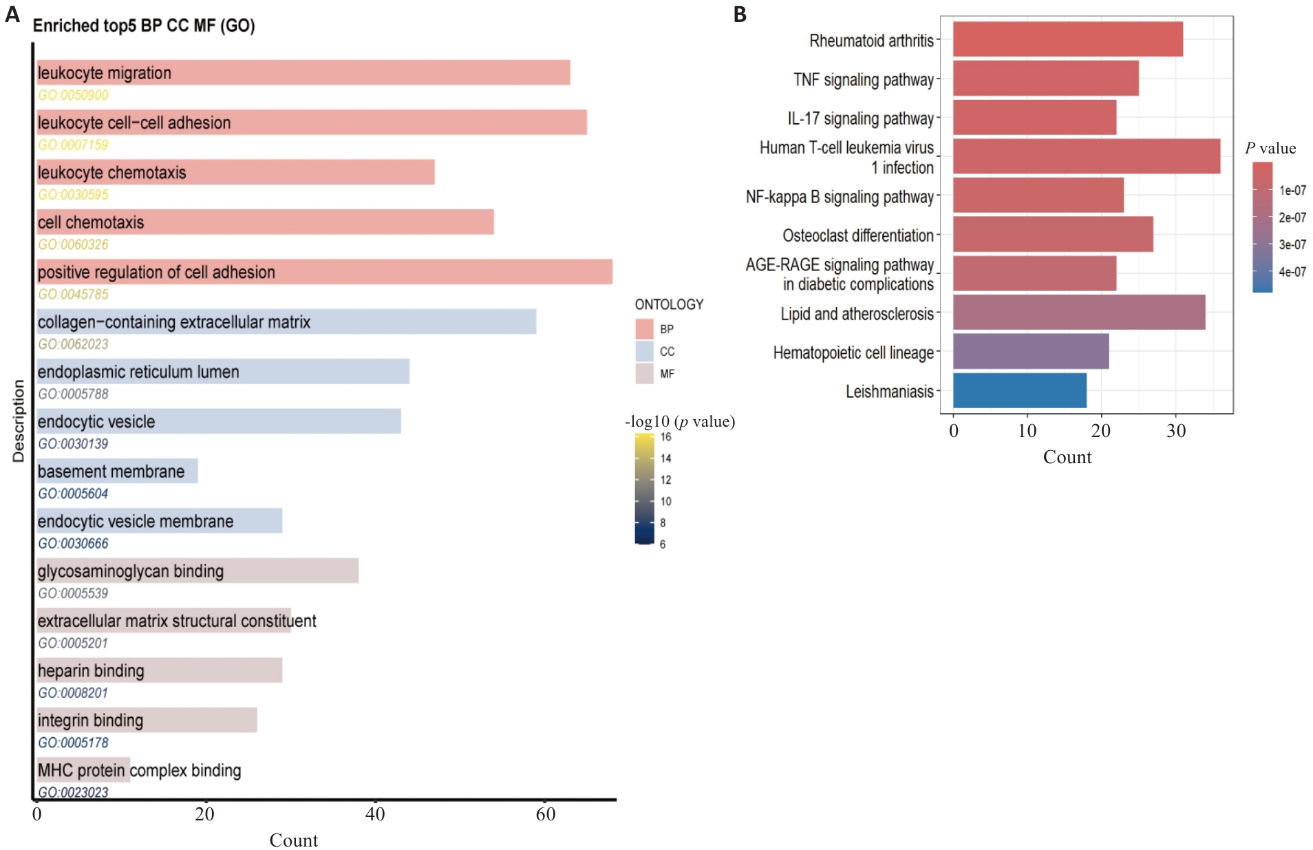 Fig.2 GO functional and KEGG pathway enrichment analysis of osteoarthritis DEGs. A: GO enrichment analysis results. B: KEGG pathway enrichment analysis results, displaying the signaling pathways significantly enriched by the DEGs.