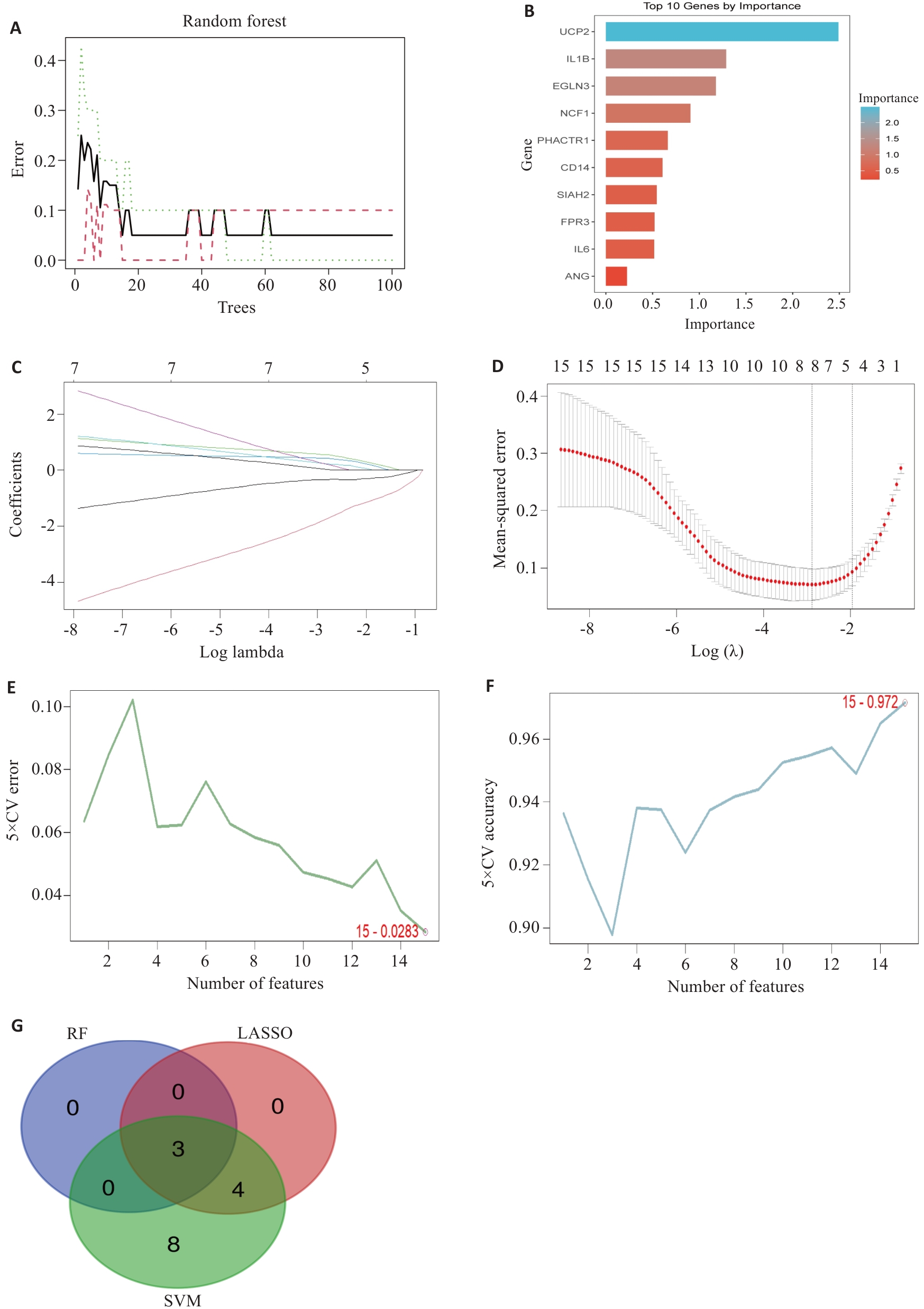 Fig.3 Machine learning screening of feature genes. A, B: RF screening process and results, showing trend of model error with increasing number of decision trees (A) and gene importance ranking (B). C, D: LASSO regression screening process and results showing model coefficient path diagram (C) and trend of cross-validation error with penalty coefficient λ (D). E, F: SVM screening process and results showing model error rate with varying number of features (E) and model accuracy with varying number of features (F). G: Venn diagram of the intersection of screening results from three machine learning algorithms, ultimately obtaining 3 consensus feature genes.