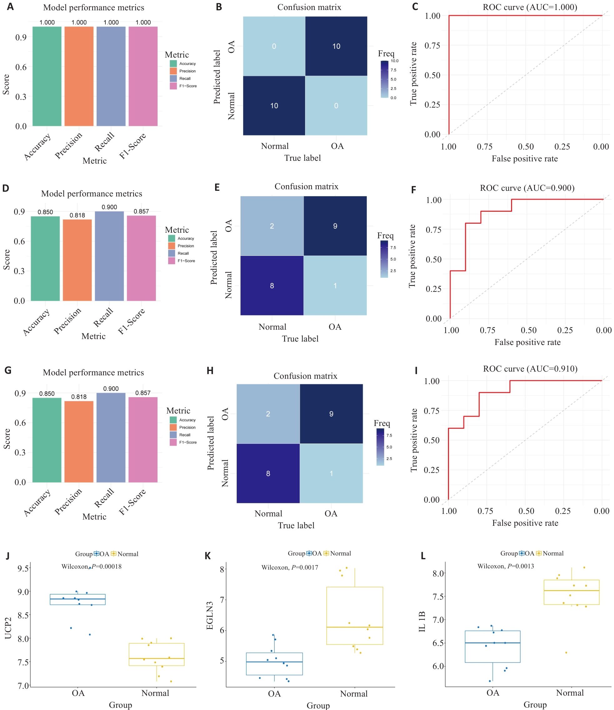 Fig.4 Comprehensive analysis of model performance evaluation. A-C: Performance assessment of the diagnostic model in the training set (GSE55235), showing the accuracy, precision, recall, and F1-score diagram (A), confusion matrix (B), and ROC curve and AUC value (C). D-F: Performance assessment of the diagnostic model in the validation set (GSE55457) showing the accuracy, precision, recall, and F1-score diagram (D), confusion matrix (E), and ROC curve and AUC value (F). G-I: Performance of the diagnostic model in the validation set (GSE117999), showing the accuracy, precision, recall, and F1-score diagram (G), confusion matrix (H), and ROC curve and AUC value (I). J-L: Comparison of expression levels of the 3 feature genes between OA patients and healthy controls (J: UCP2; K: EGLN3; L: IL1B).