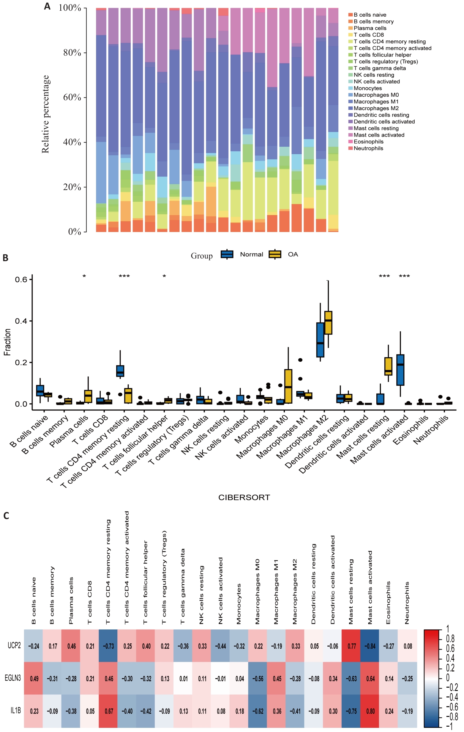 Fig.6 Immune infiltration analysis. A: Infiltration of immune cells in OA patient samples and healthy control samples, with different colors representing different immune cells. B: Comparison of immune cell infiltration between OA patient samples and healthy control samples. C: Correlation between feature genes and immune cells, with color depth representing the strength of correlation. *P<0.05, ***P<0.001.