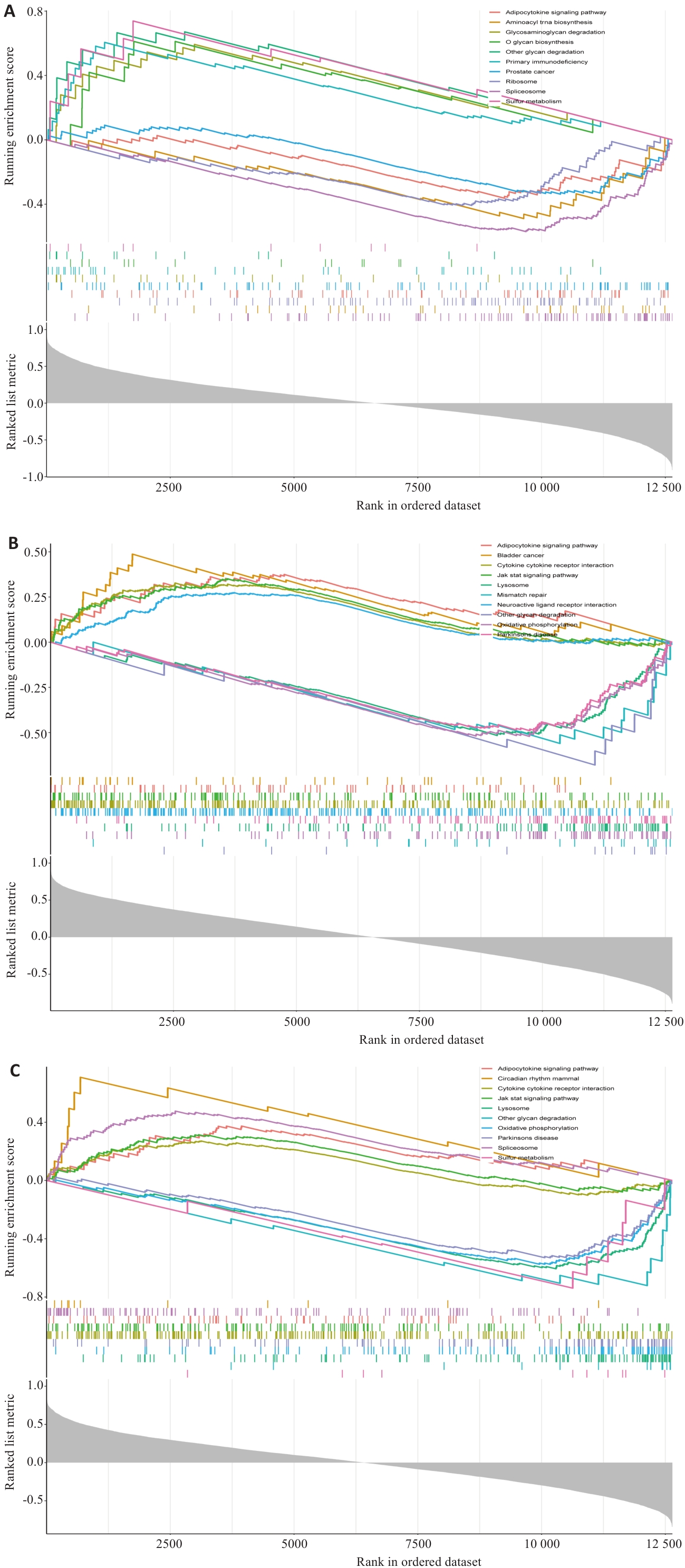 Fig.7 GSEA enrichment analysis results of the feature genes. A: GSEA enrichment analysis results of UCP2. B: GSEA enrichment analysis results of EGLN3. C: GSEA enrichment analysis results of IL1B.