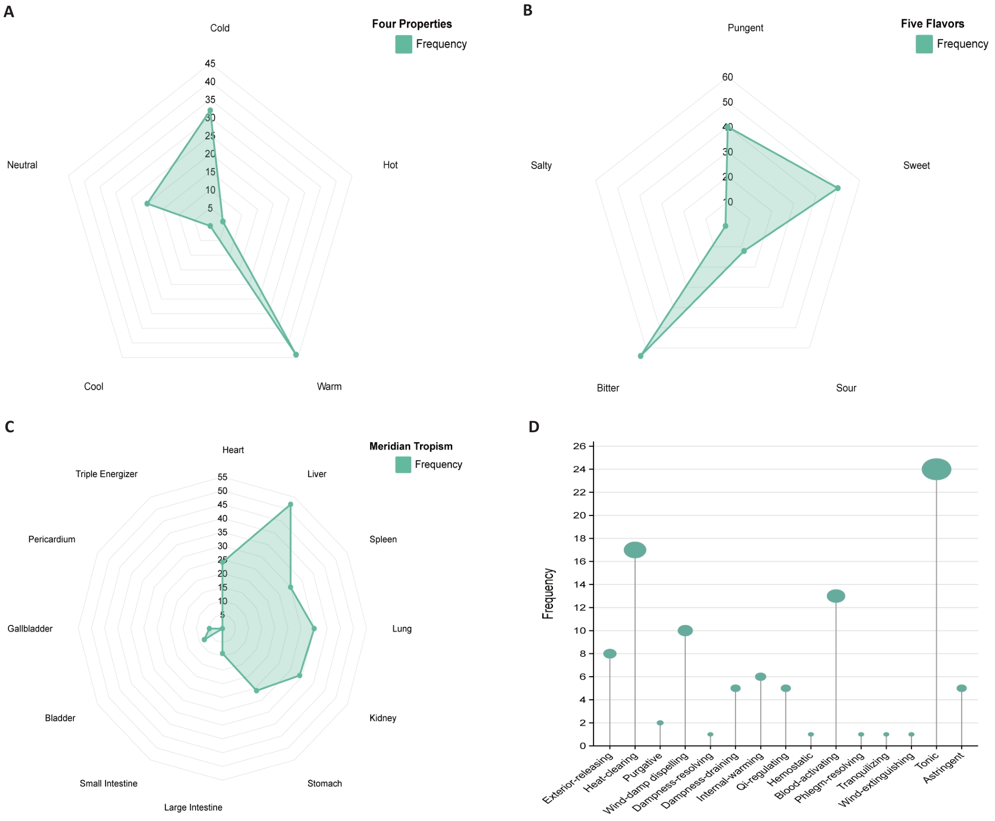 Fig.8 Prediction of traditional Chinese medicines. A: Radar chart of four properties frequency. B: Radar chart of five flavors frequency. C: Radar chart of meridian tropism frequency. D: Frequency diagram of efficacy classification.