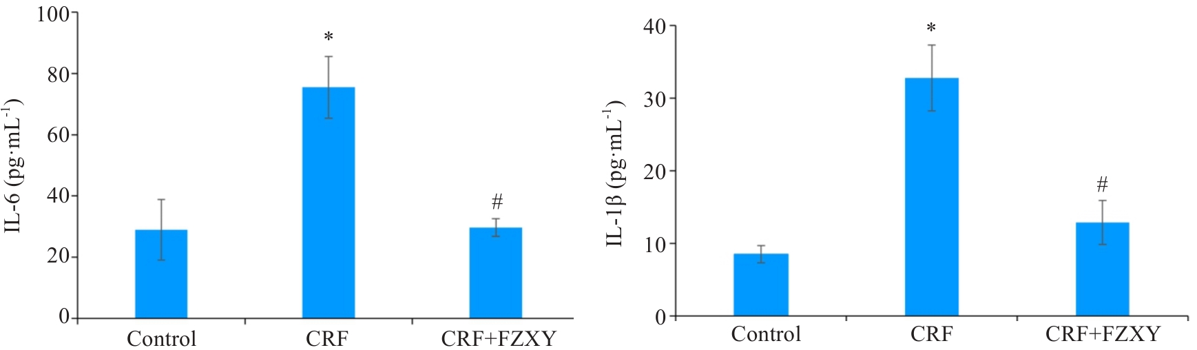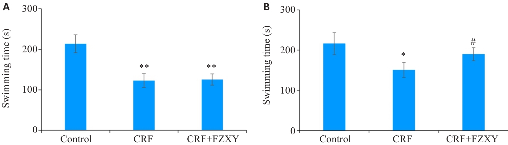 Fig.9 Performance of the mice in forced swimming test in different groups. A: After successful model establishment; B: After FZXY intervention. *P<0.05, **P<0.01 vs control group; #P<0.05 vs CRF group.