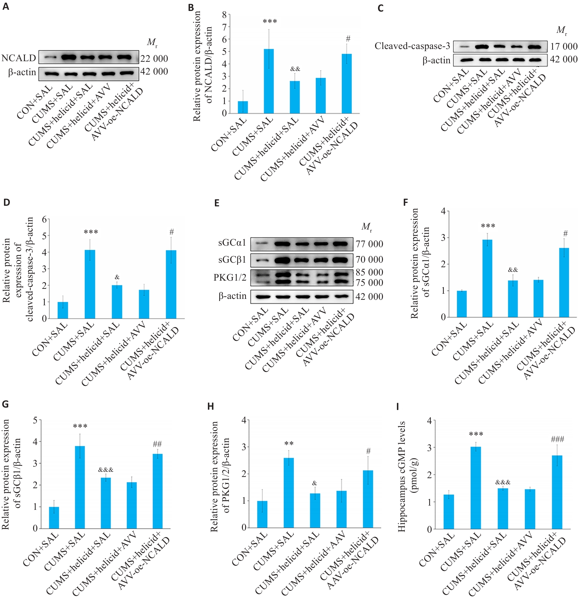 Objective To investigate the molecular mechanism of helicid for improving depressive-like behaviors in rats exposed to chronic unpredictable mild stress (CUMS). Methods SD rats were randomly divided into normal control group (n=20) and CUMS group (n=70) to receive no stimulation and mild unpredictable stress for 6 weeks, respectively. After successful modeling, CUMS rats were further divided into 7 subgroups for intracerebroventricular injection with saline, adeno-associated virus (AAV) vector, or AAV carrying si-NCALD (NCALD silencing experiment, n=10); or intracerebroventricular injection with saline, saline with daily helicid gavage, AAV vector with helicid gavage, or NCALD-overexpressing AAV with helicid gavage (NCALD overexpresison experiment, n=10). The depressive state of the rats was evaluated by assessing changes in body weight, sucrose preference, and open field test. The expressions of NCALD, sGCα1, sGCβ1, PKG1/2, and cleaved-caspase 3 in the hippocampus of the rats were detected by Western blotting, and hippocampal cGMP level was determined with ELISA. Results Compared with the normal control rats, CUMS rats showed significantly increased hippocampal expressions of NCALD and cleaved caspase-3 and abnormal activation of the sGC/cGMP/PKG pathway. Silencing NCALD by intracerebroventricular injection of AAV-si-NCALD significantly reduced cleaved caspase-3 and inhibited sGC/cGMP/PKG pathway activation in the hippocampus, and improved depressive-like behaviors of the rats. Helicid treatment produced similar effects, but its effect was abolished by intracerebroventricular injection of NCALD-overex-pressing AAV. Conclusion Helicid relieves depressive-like behaviors in CUMS rats by downregulating NCALD, inhibiting abnormal sGC/cGMP/PKG activation, and reducing hippocampal apoptosis.