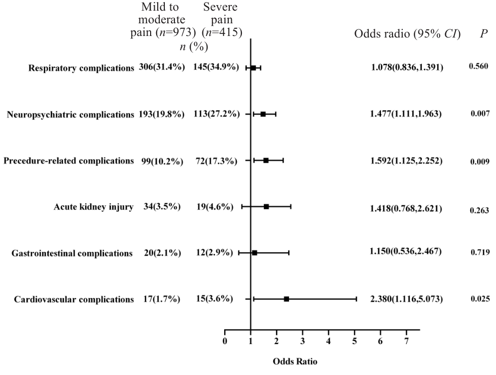 | Fig.2 Forest plot of the effect of acute postoperative pain on postoperative complications in elderly patients undergoing gastrointestinal surgeries. |