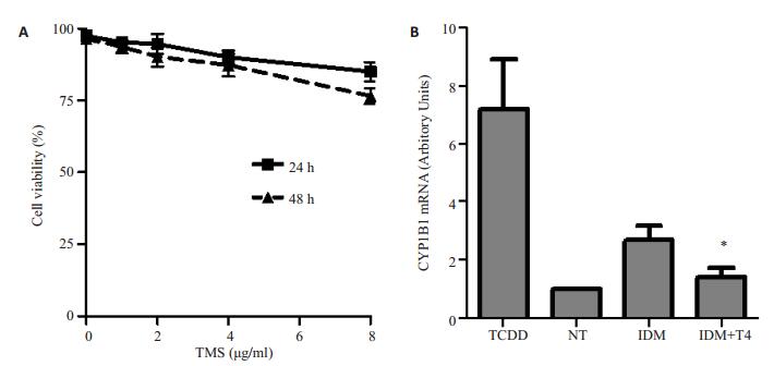 2 结果 2.1 TMS对C3H10T1/2细胞生存率的影响虽然随着TMS浓度增高,C3H10T1/2细胞的生存率逐渐下降,但是在TMS 8 μg/ml情况下48 h的存活率依然达到80%左右,而本实验最大剂量4 μg/ml,对细胞的生存没有明显影响(图 1A)。在mRNA水平,TMS抑制了CYP1B1的表达(图 1B)。TCDD作为CYP1B1的诱导剂设置为阳性对照。