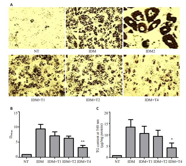 图 2 TMS抑制C3H10T1/2多潜能干细胞的脂肪分化 Figure 2 TMS suppresses induced adipogenic differentiation of C3H10T1/2 cells. A: Oil Red-O staining; B: Quantitative analysis of Oil Red-O staining results (absorbance at 490 nm); **P < 0.01 vs IDM group. C: TG contents. *P < 0.05 IDM group. NT: No Treatment; T1, T2, T4: 1, 2, 4 μg/ml TMS, respectively. IDM2 presents a magnified section of IDM. |