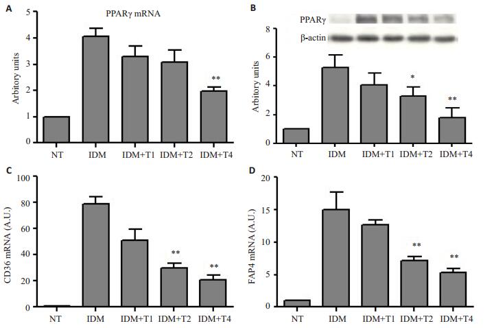 图 3 TMS抑制IDM诱导的C3H10T1/2多潜能干细胞脂肪分化过程中PPARγ的表达 Figure 3 TMS inhibits PPARγ expression in C3H10T1/2 cells induced by IDM. A: Expression of PPARγ mRNA; B: Expression of PPARγ protein; C: Expression of CD36 mRNA; D: Expression of FABP4 mRNA. *P < 0.05, **P < 0.01 vs IDM group. |