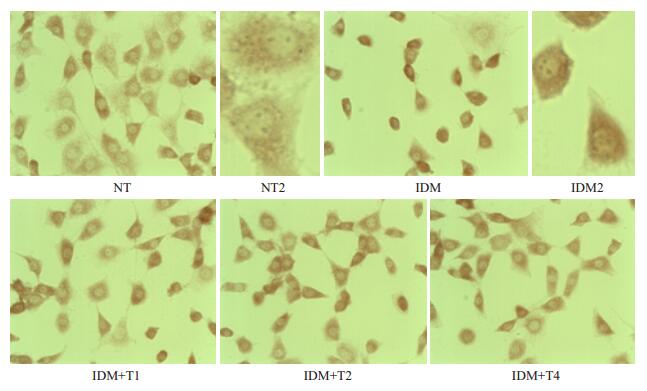 图 4 TMS抑制C3H10T1/2多潜能干细胞PPARγ表达 Figure 4 TMS attenuates expression of PPARγ in C3H10T1/2 cells during adipogenesis (Immunohistochemistry, DAB staining). NT2 and IDM2 present magnified images (Original magnification: × 400) of NT and IDM (Original magnification: ×200), respectively |