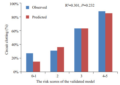 Hosmer-Lemeshow检验结果显示,CRRT体外循环堵塞风险积分模型的拟合度良好,预测堵管的发生率与实际堵管发生率无统计学差异(P=0.232,图 1)。