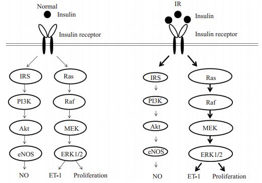 图 1 胰岛素作用于血管细胞的信号通路 Figure 1 Insulin signaling pathways in vascular cells. |
