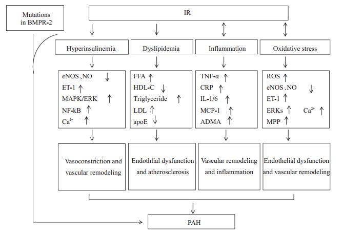 图 2 IR与PAH的相关机制 Figure 2 Mechanisms by which IR promotes the development of PAH. |