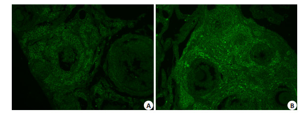 图 1 免疫荧光检测两组小鼠卵巢AZP3Ab表达的结果 Figure 1 Immunofluorescence assay of AZP3Ab expression in the ovary of the two groups (Original magnification: ×200). A: Control group, AZP3Ab (-); B: Model group, AZP3Ab (+). |