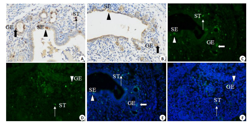 图 2 免疫组化和免疫荧光方法检测两组小鼠子宫Ki-67表达的结果 Figure 2 Immunohistochemistry (IHC) and immunofluorescence (IF) assay of Ki-67 expression in the uterus in the two groups (Original magnification: × 400). Cells with positive immunostaining within different uterine compartments are indicated by an triangle in the surface epithelium (SE), a coarse arrow in the glandular epithelium (GE), or a thin arrow in the stromal tissue (ST). A: IHC, Control group, Ki-67 (++); B: IHC, Model group, Ki-67 (+); C and E: IF, Control group; D and F: IF, Model group. |