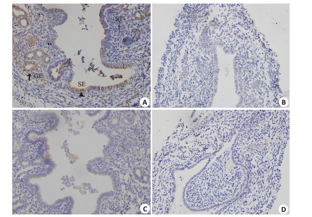图 3 免疫组化检测两组小鼠子宫ERα、ERβ表达结果 Figure 3 Immunohistochemistry of ERα and ERβ expression in the uterus in the two groups (Original magnification: ×400). Cells with positive immunostaining within different uterine compartments are indicated by an triangle in the surface epithelium (SE), a coarse arrow in the glandular epithelium (GE), or a thin arrow in the stroma tissue (ST). A: Control group, ERα(+); B: Model group, ERα(-); C: Control group, ERβ(-); D: Model group, ERβ(-). |
