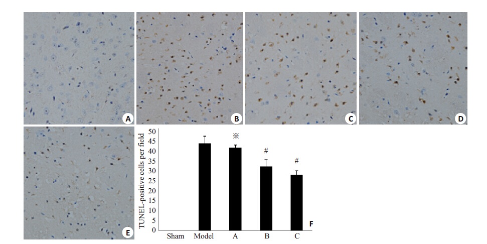 图 3 不同组别大鼠TUNEL阳性细胞观察 Figure 3 Observation of TUNEL-positivecells in different rats (A-E, Originalmagnification: × 200). Sham group; B:Model group; C: A group; D: B group;E: C group; F: TUNEL-positive cells perfield (*P>0.05 vs Model group, #P<0.05vsModel group). |