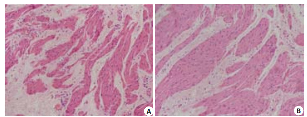 HE染色,观察糖尿病组与正常对照组的膀胱组织形态结构变化,结果发现(图 1):糖尿病组(A)膀胱平滑肌细胞排列紊乱、细胞外基质沉积,结构松散,而正常对照组(B)膀胱组织平滑肌细胞排列整齐紧密,细胞外充满结缔组织。