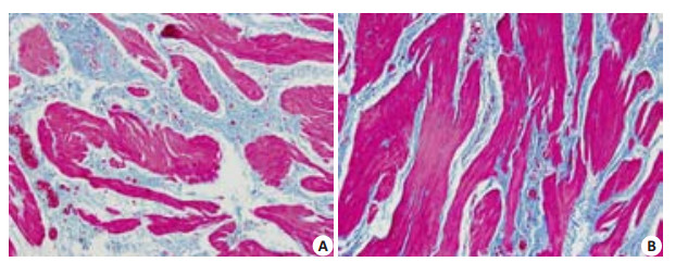 图 2 Masson's Trichrome染色 Figure 2 Masson's Trichrome staining of the bladder tissue of diabetic (A) and control (B) rats (Original magnification, ×200). |